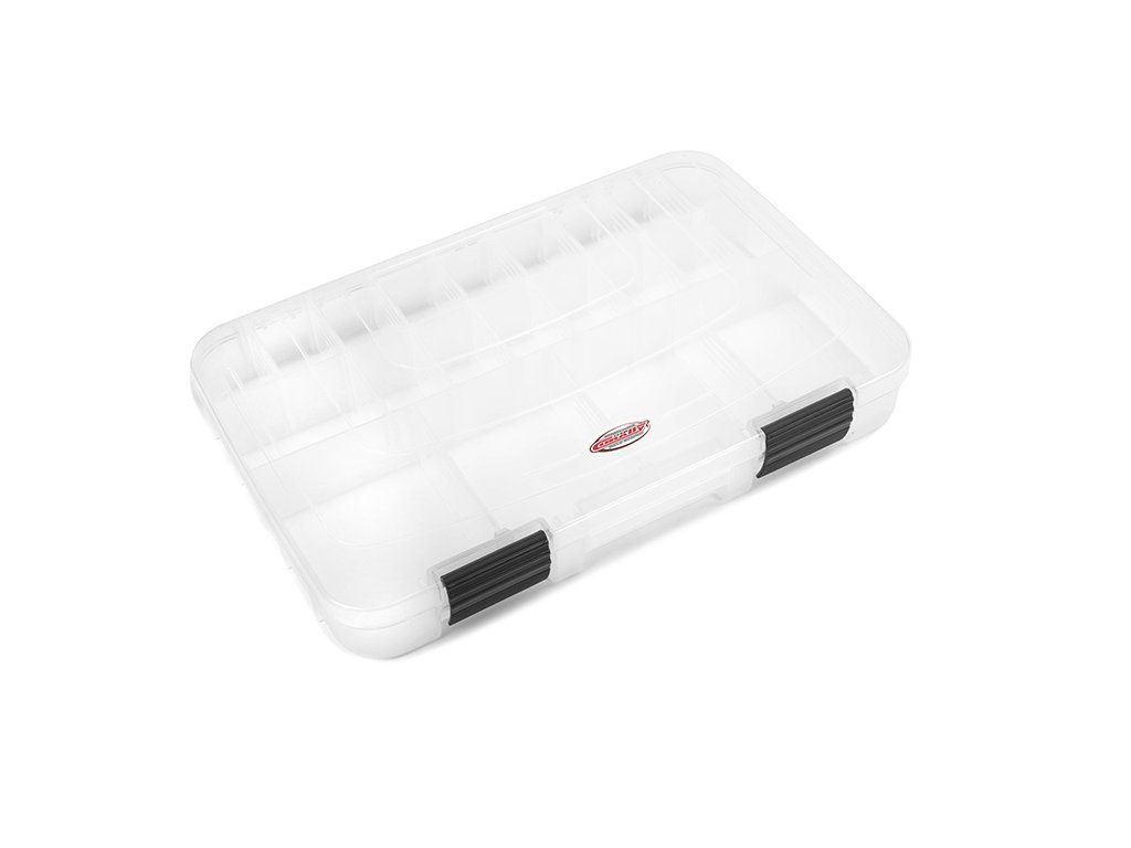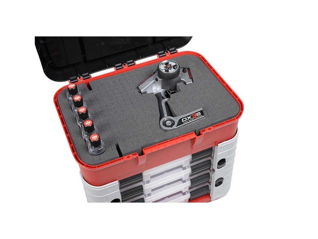 Polypropylenový kufr PIT CASE od týmu Corally má čtyři velké boxy s nastavitelnými přihrádkami a bezpečnými zámky, prostorný úložný prostor pod víkem pro vysílač nebo nabíječku a 3 další přihrádky ve víku s pohyblivými přepážkami.