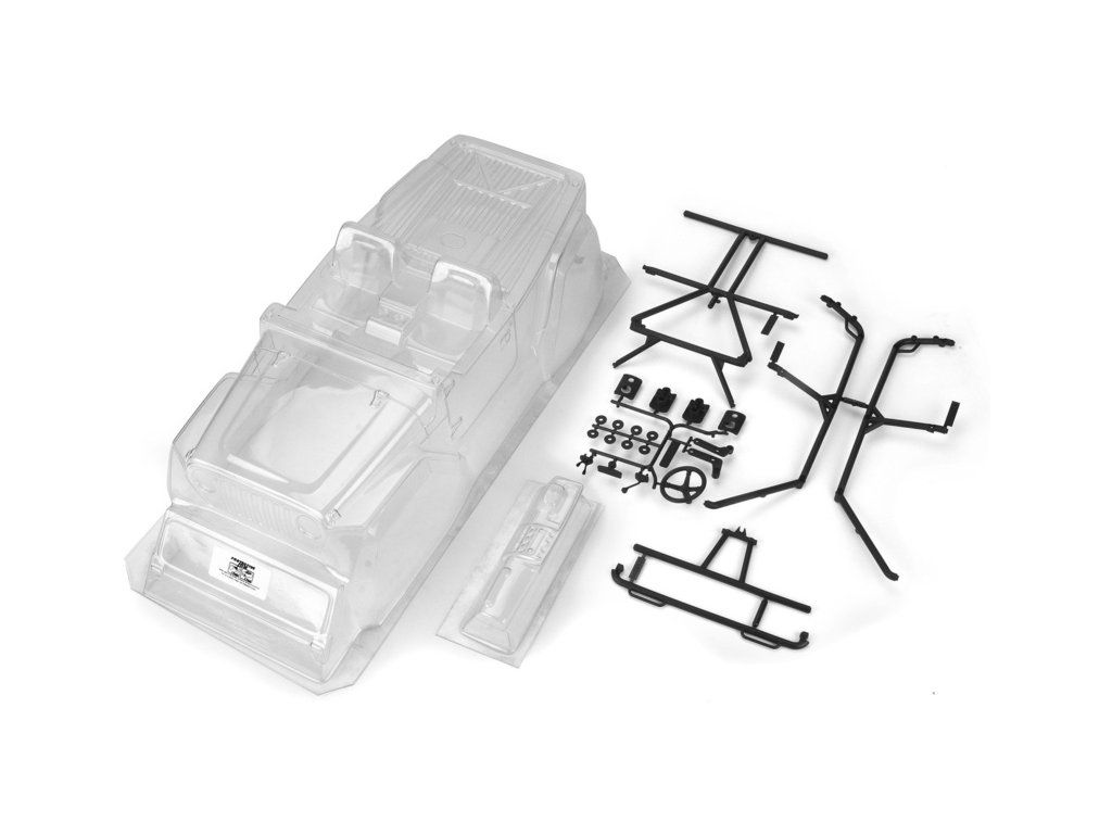 Balení obsahuje čirou karoserii, obtiskový arch, masku oken, klec, 2x zadní brzdová světla, volant, 2x páku řazení, zpětné zrcátko, držáky na LED světlo, sponky karoserie, montážní příslušenství - šrouby 18x M3x8 BHCS, 8x M3x12 BHCS, 8x M2,5x6 SHCS, 4x pojistná matice M3.