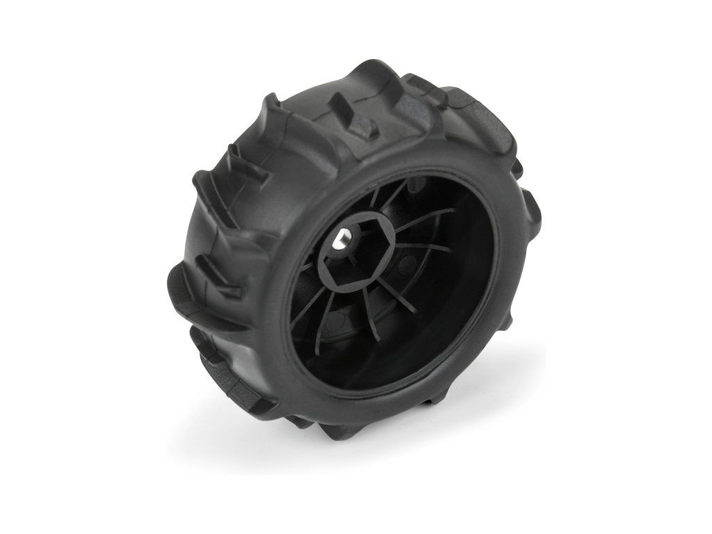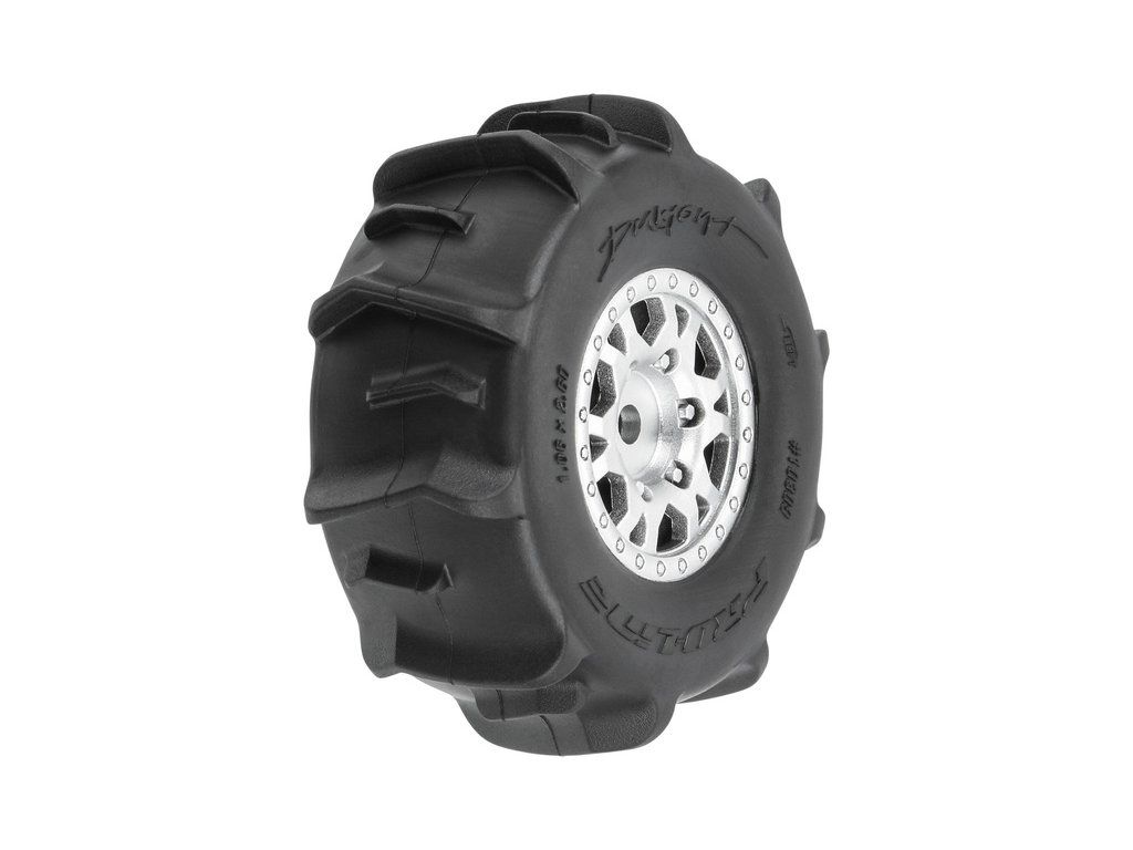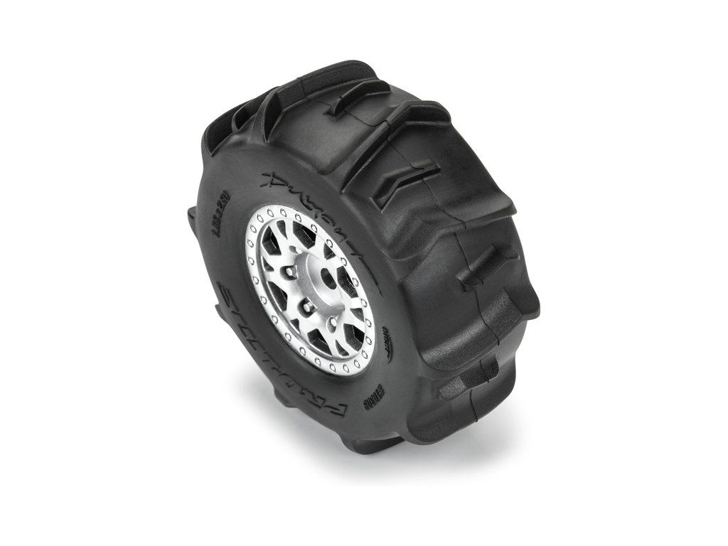 Kompletní kola Pro-Line pro RC modely aut 1:16 Mojave GROM. Rozměr ⌀66x26 mm. Disk má stříbrnou barvu. Pádlové pneumatiky Dumont 1.2". Unašeč je šestihran 12mm. Vložka Open Cell.