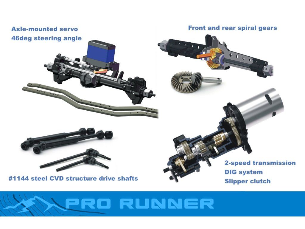 Zatímco jedním mikro servem je ovládáno řazení mezi prvním a druhým rychlostním stupněm, druhé je vyhrazeno pro přepínání mezi náhonem na všechna kola, na přední kola a funkcí DIG, což přináší další možnosti a schopnosti při prostupu těžkým terénem.