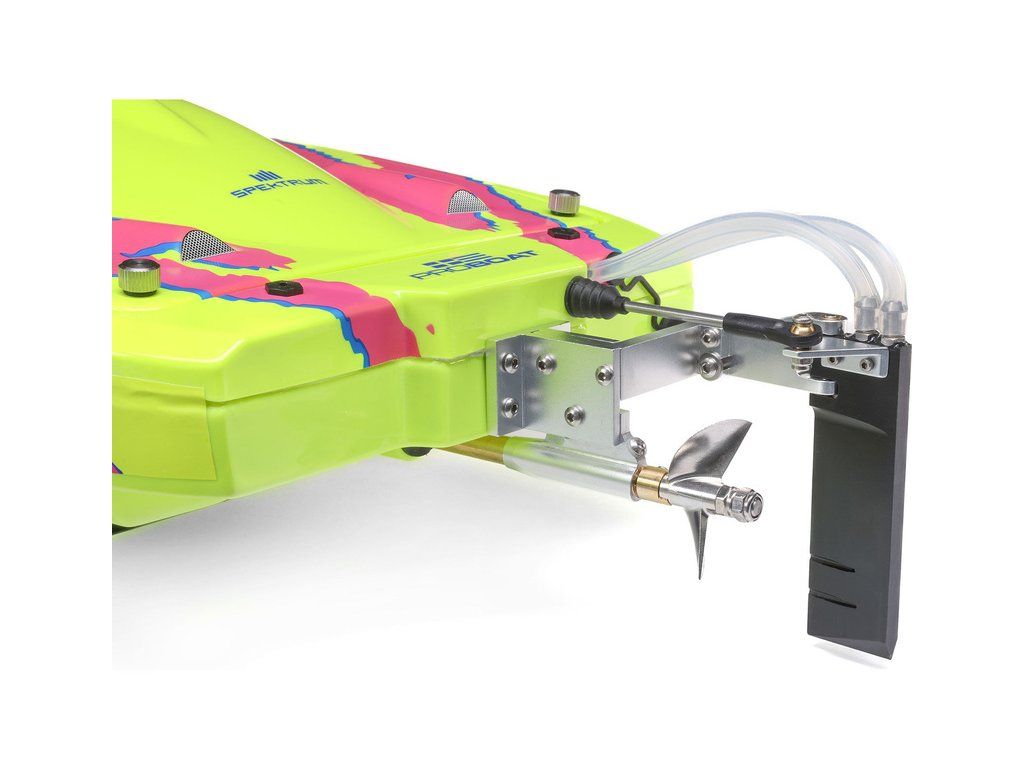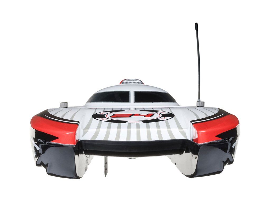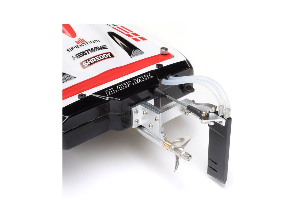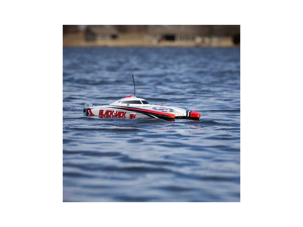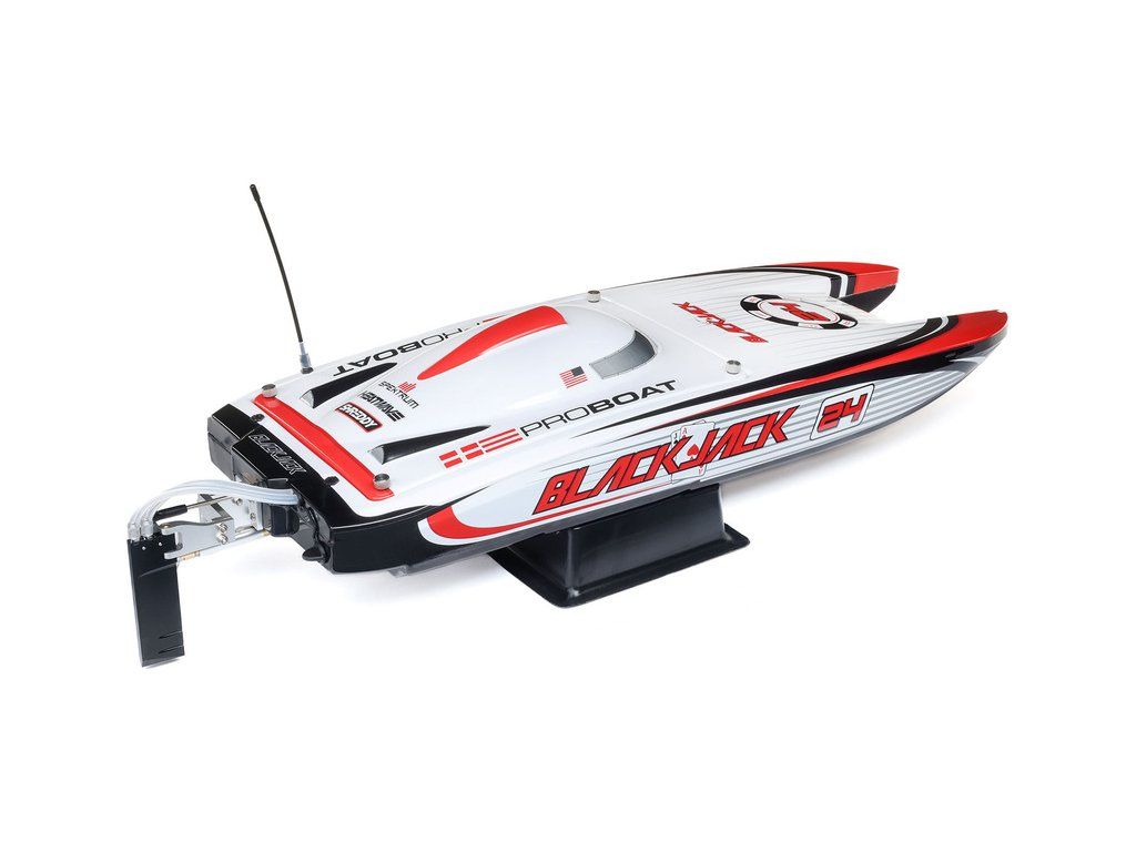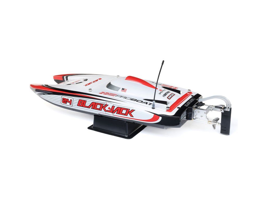 Rychlostní RC model katamaránu Proboat Blackjack 24" V2 s výkonným střídavým pohonem Spektrum Firma 4S a rychlostí až 48 km/h. Snadná instalace baterií do trupu, zjednodušené mazání lodní hřídele, odklopné kormidlo, proti poškození, 2kanálový vysílač SLT2 2,4GHz.