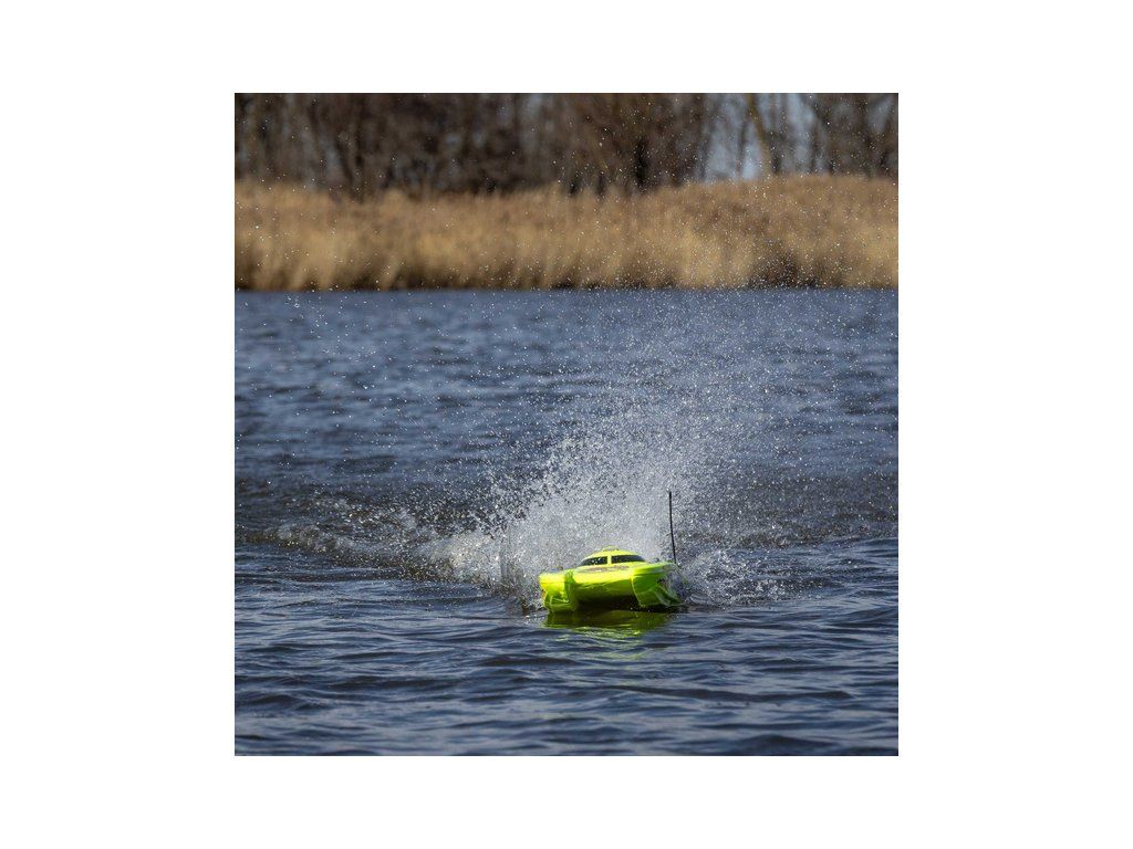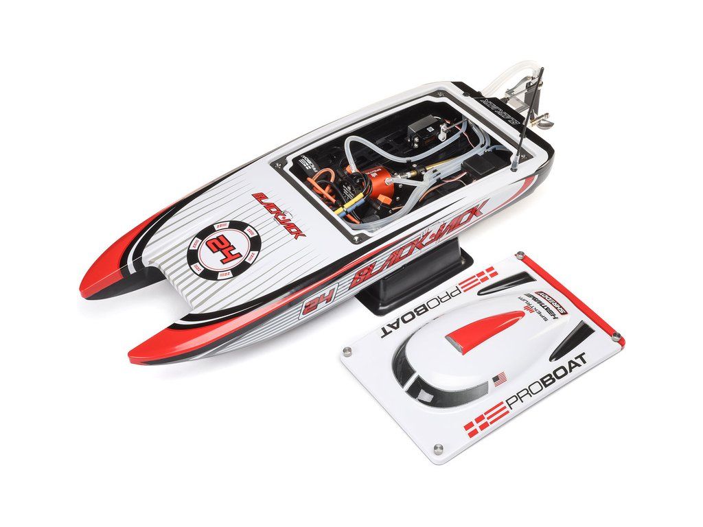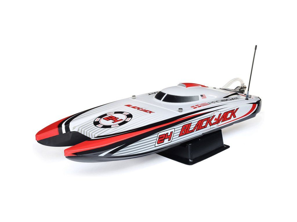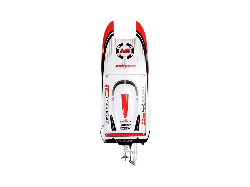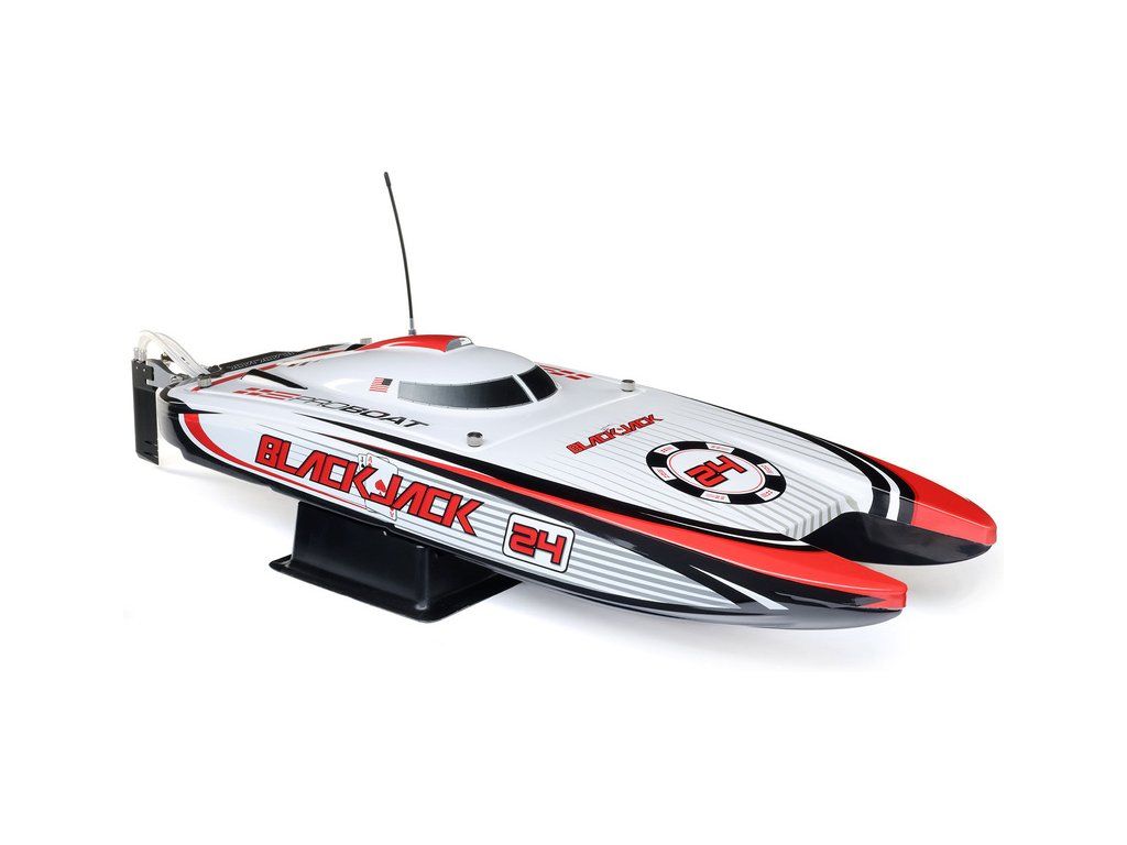 Rychlostní RC model katamaránu Proboat Blackjack 24" V2 s výkonným střídavým pohonem Spektrum Firma 4S a rychlostí až 48 km/h. Snadná instalace baterií do trupu, zjednodušené mazání lodní hřídele, odklopné kormidlo, proti poškození, 2kanálový vysílač SLT2 2,4GHz.
