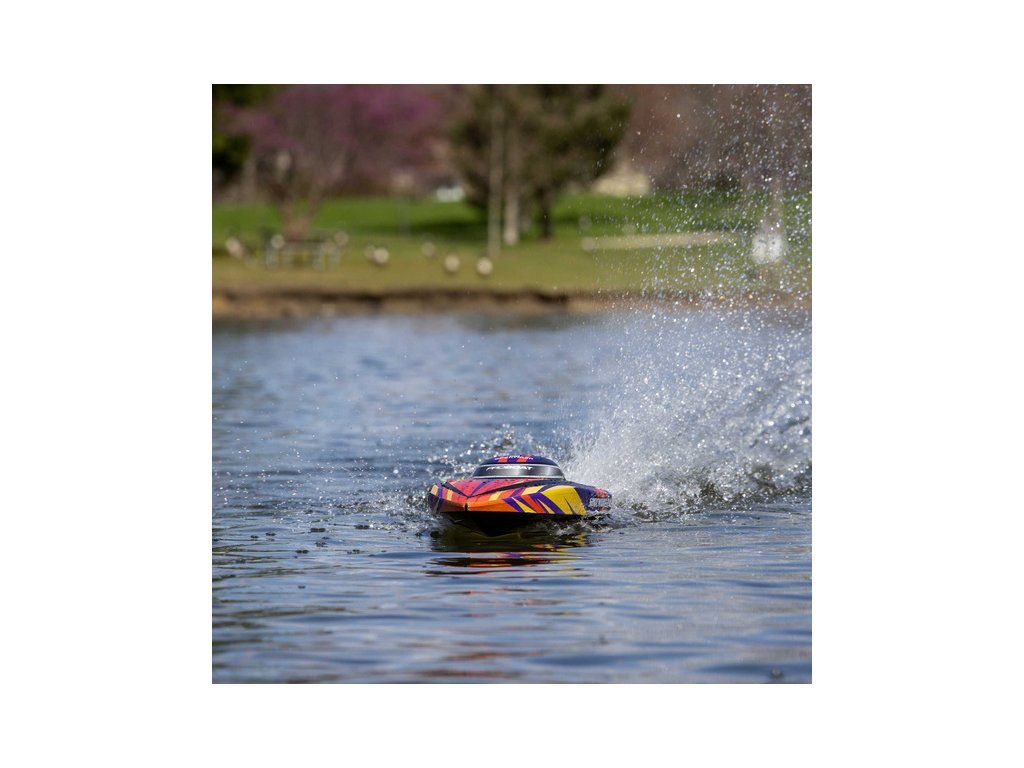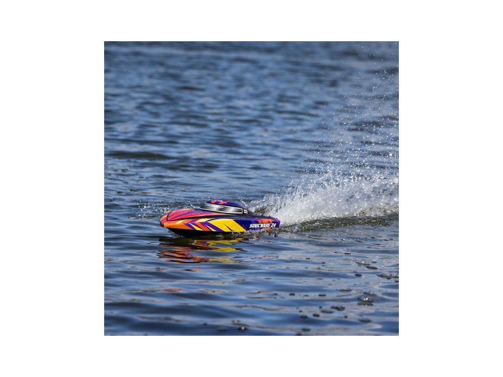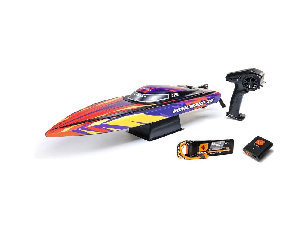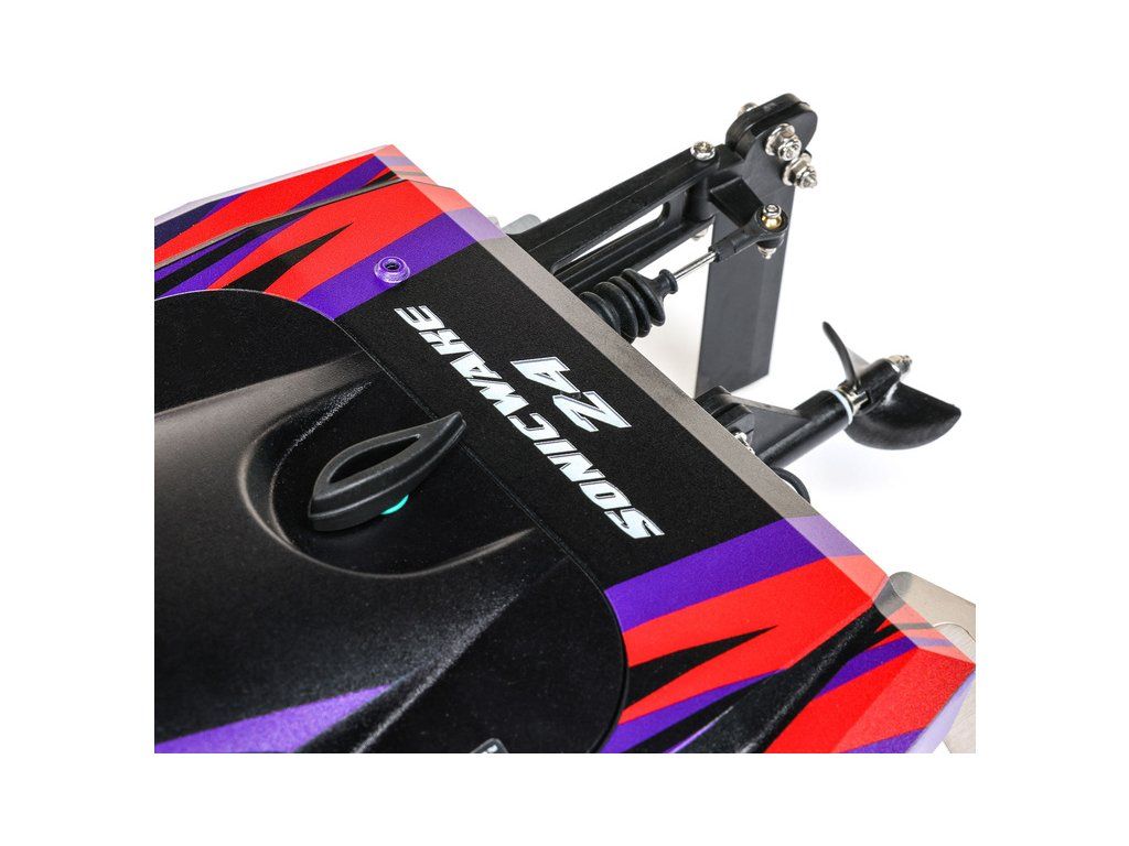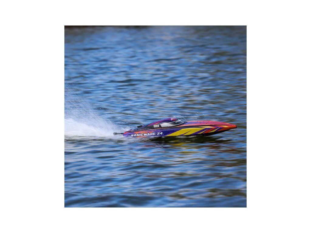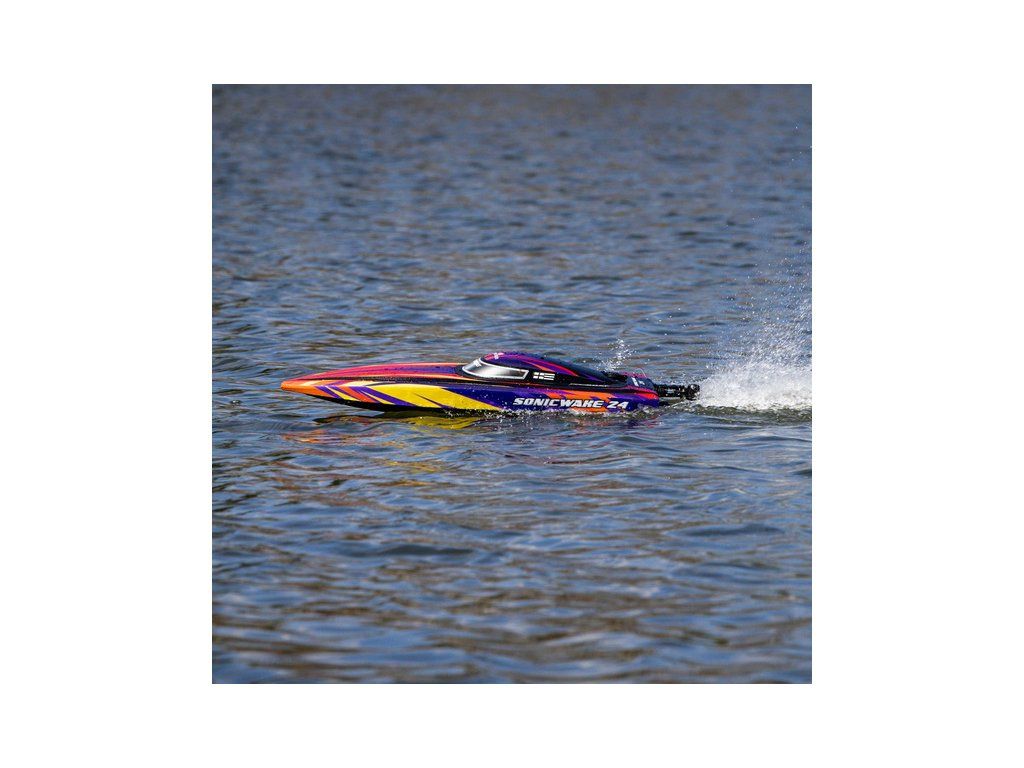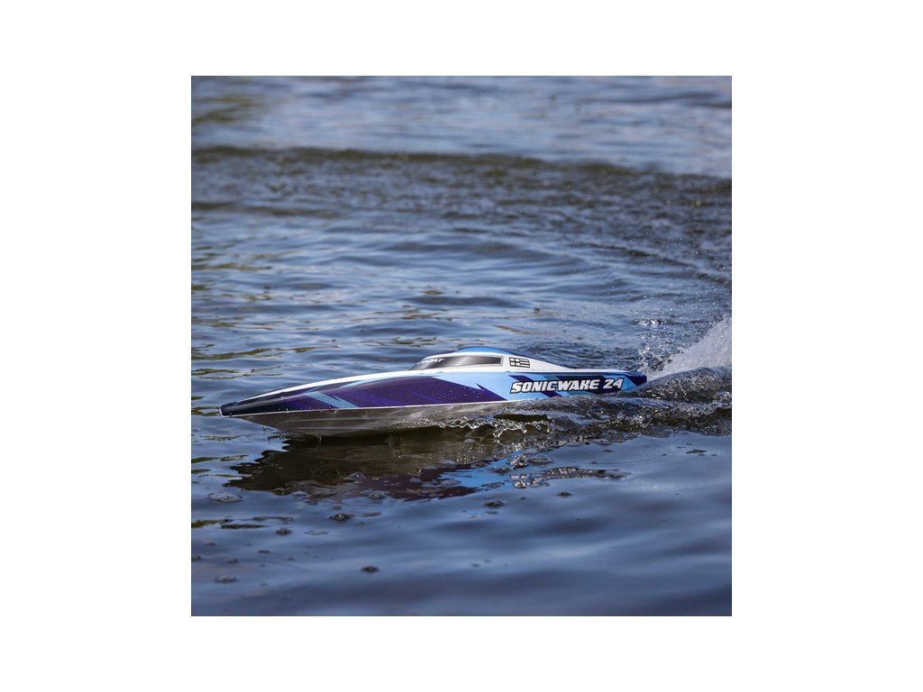Rychlostní člun střední velikosti Proboat Sonicwake 24" s exkluzivní funkcí automatického otočení (Self-righting). Instalován je vodou chlazený střídavý motor 2500Kv a regulátor Spektrum 50A pro rychlost až 56 km/h. Vše potřebné je v balení - vč. akumulátoru 3S LiPo a USB nabíječe.