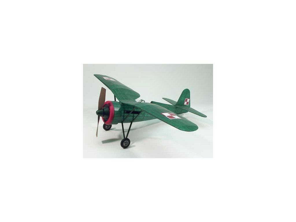 Stavebnice volně létající polomakety polského stíhacího hornoplošníku určená pro pohon gumovým svazkem. Model je klasické celobalsové konstrukce v rozsypu s laserem vyřezávanými dřevěnými díly, maketovými doplňky z vakuově tvářeného plastu a plastovými díly zhotovenými vstřikovým lisováním. Trup je konstruován pravou minimaketářskou technologií s přepážkami a velkým množstvím podélníků, které umožňují věrně reprodukovat oblé tvary moderních strojů. Staví ve dvou krocích - díky "rozříznutí" ve svislé rovině postavíte přímo na pracovní desce nejprve jednu polovinu trupu, a k ní poté "dolepíte" polovinu druhou. Tak je zajištěno, že i trup komplikovaných tvarů postavíte rovný a souměrný, bez potřeby jakýchkoliv speciálních přípravků. Křídlo je klasické konstrukce z nosníků a žeber, ocasní plochy z balsových lišt a laserem vyřezávaných dílů.