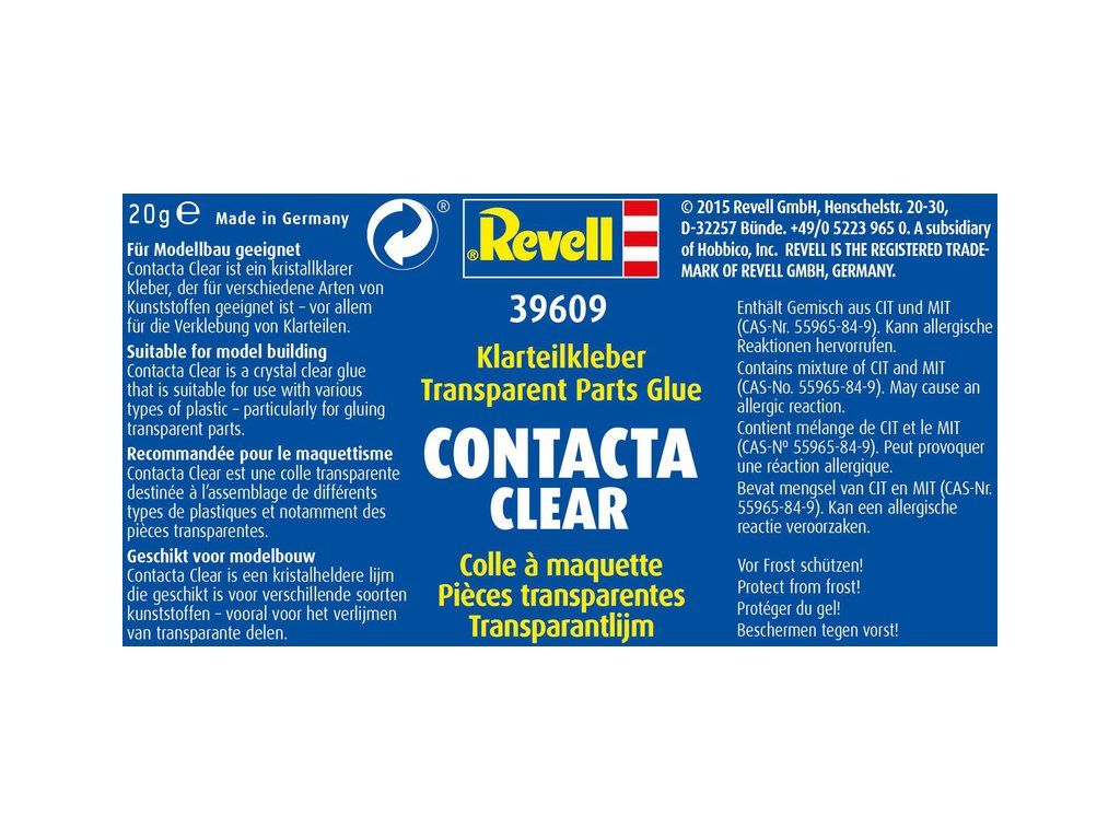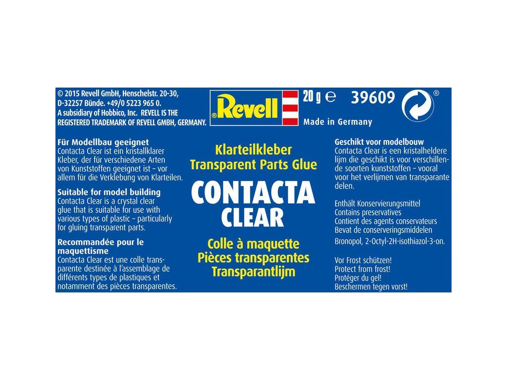 Revell Contacta Clear je speciální průhledné lepidlo pro přilepení průhledných plastových modelu. Nezpůsobuje zbělení plastů. Obsah 20 g.