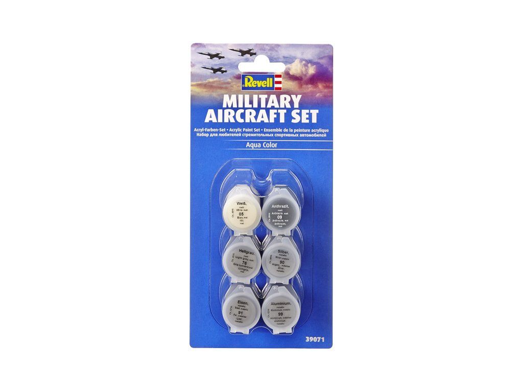 Sada šesti akrylových barev pro modeláře Revell 39071 Aqua Color nejčastěji používaných na vojenských letounech. Barvy jsou po 5 ml.