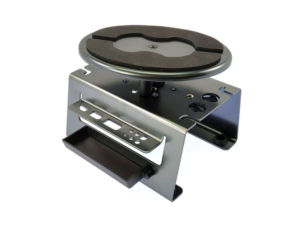 Otočný stojan pro údržbu a opravy RC modelů aut v měřítku 1:8 až 1:10. Otočný stolek může být zafixován v 8 pozicích. Ve stojanu jsou dál přihrádky pro nářadí a stavitelné otvory pro sestavování tlumičů. Vyrobeno z šedě eloxovaného duralového plechu.