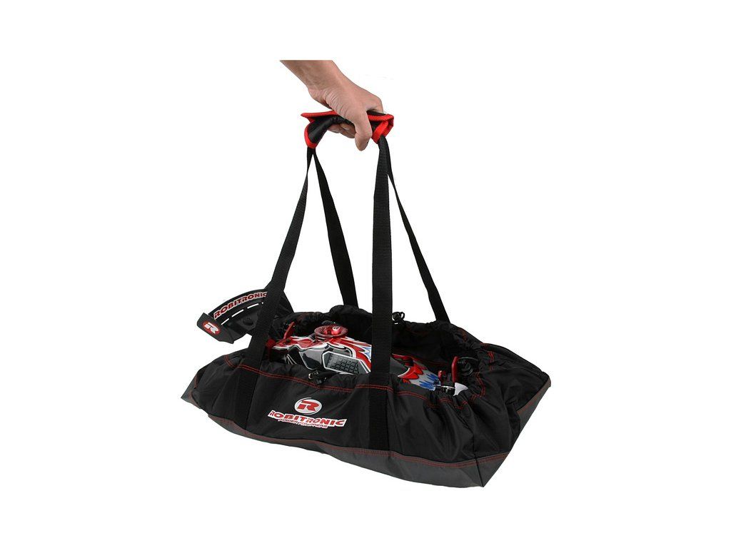 Robitronic taška pro auta Buggy 1:8 má rozměry 33 cm x 57 cm x 15 cm, na konci lemu je stahovací šňůra. Délka ucha je cca 30 cm. Pevná prošitá textilie s pevnými uchy. Uložte model po jízdě do tašky a udržte sedadla, či zavazadlový prostor čistý a suchý.