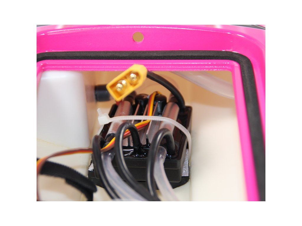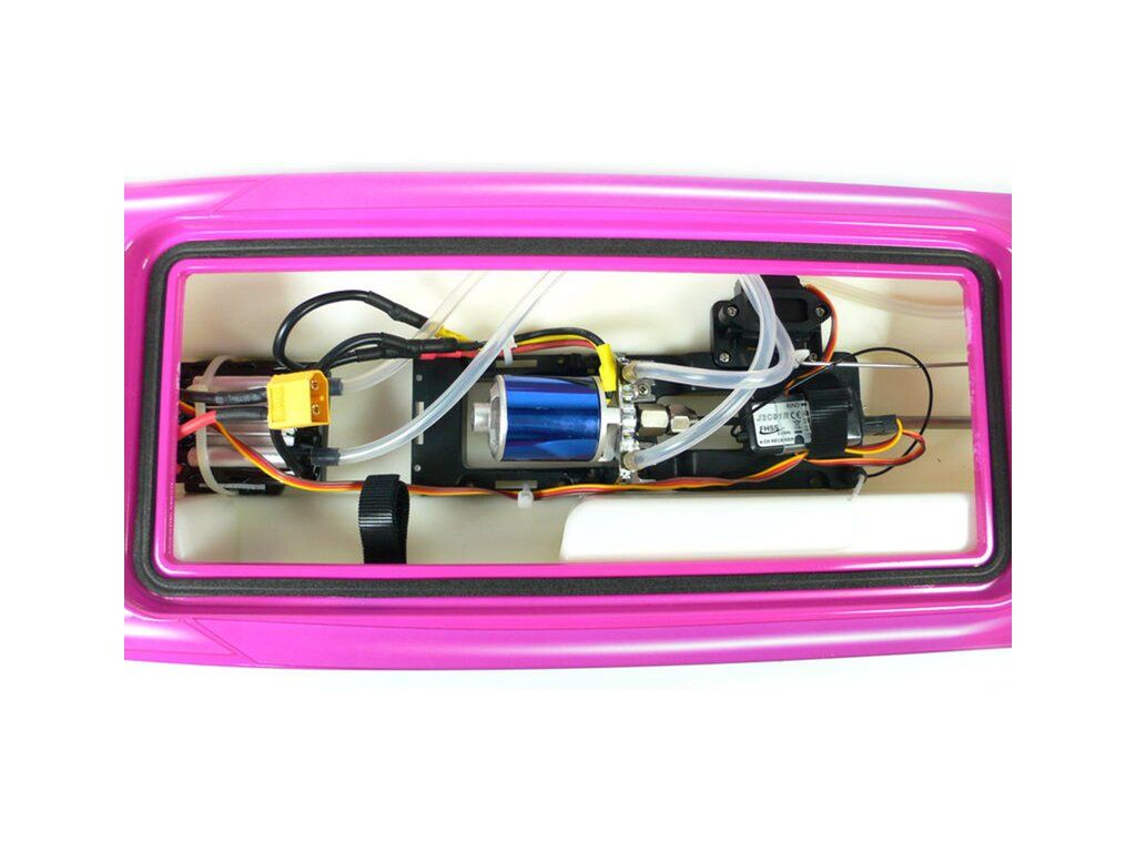 Hotový sestavený nabarvený RC model lodi Rocket Brushless V2 s nainstalovaným vodou chlazeným střídavým motorem, 30A vodou chlazeným střídavým regulátorem s konektorem XT60, voděodolným servem 9g MG a 4-kanálovým přijímačem J2C91R 2,4HGz, V balení je náhradní lodní šroub, lepící páska, balonek na přijímač, konektor XT60 pro baterii se smršťovací bužírkou, imbusy 2mm a 2,5mm, stahovací páska, suchý zip pro baterii, pásky mechové gumy, vysílač Joysway 2,4GHz FHSS, stojánek a manuál.