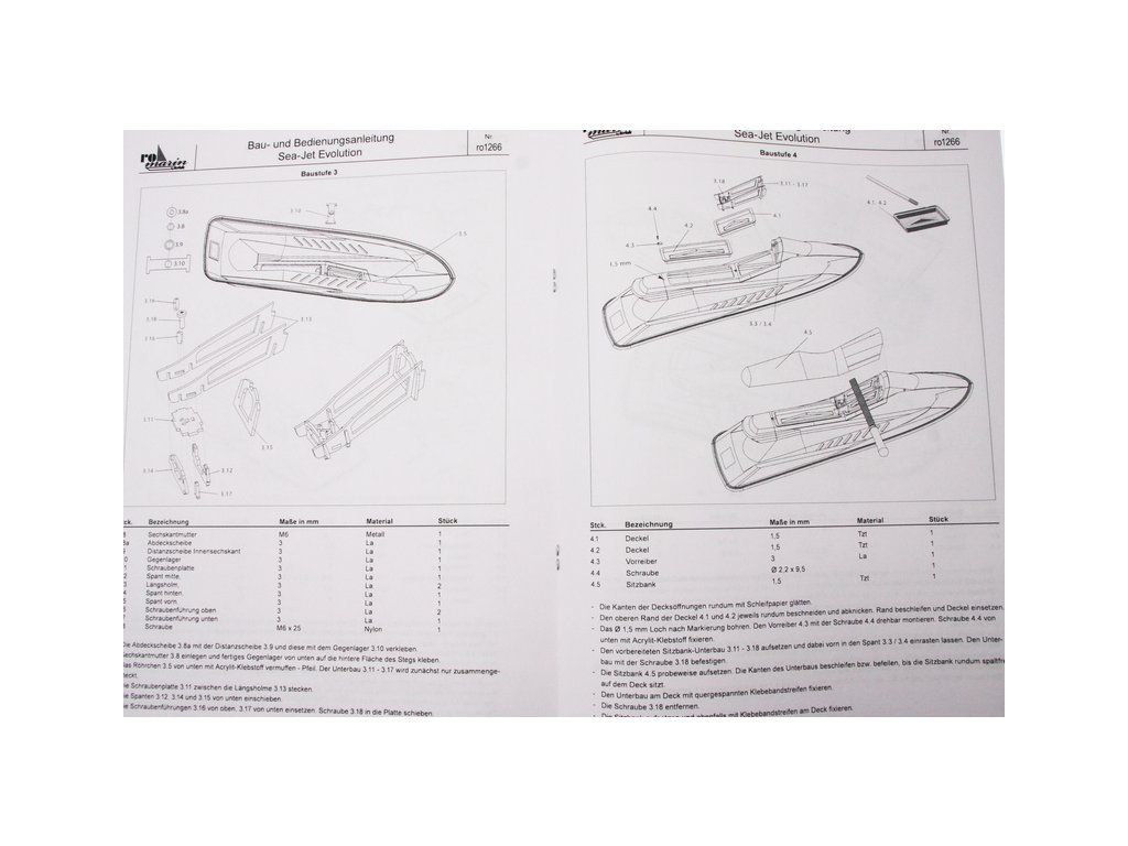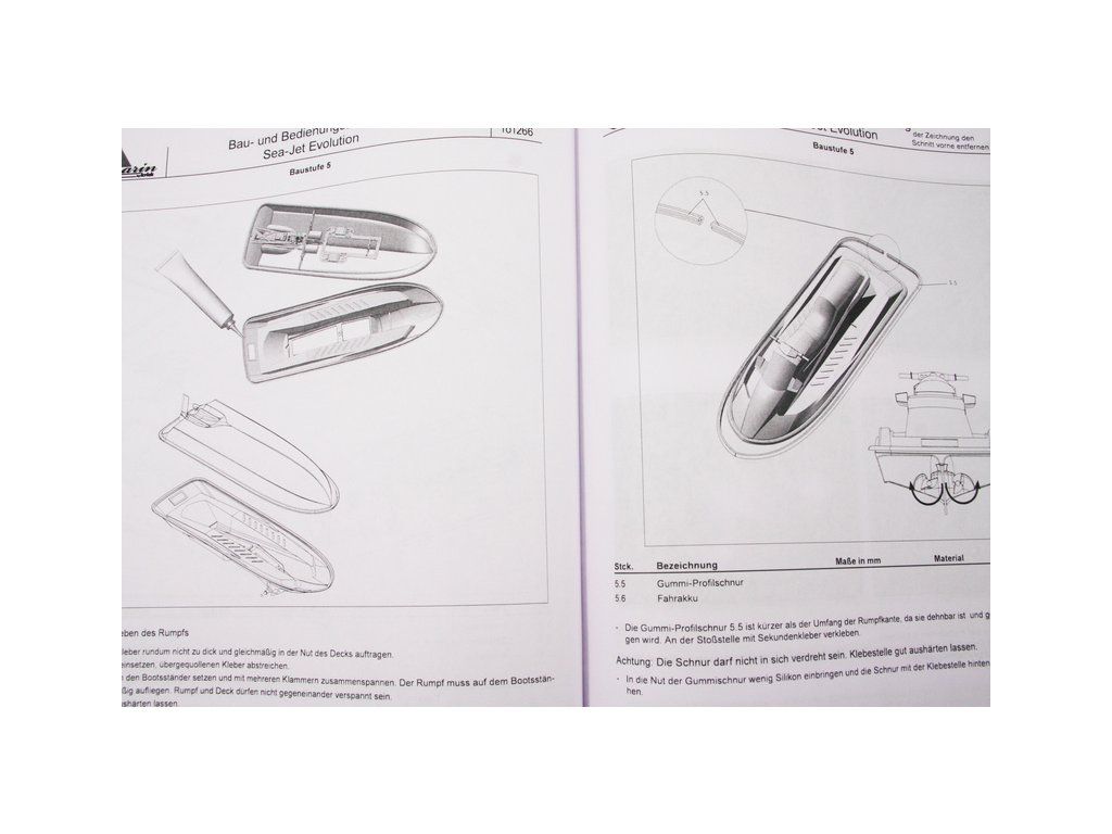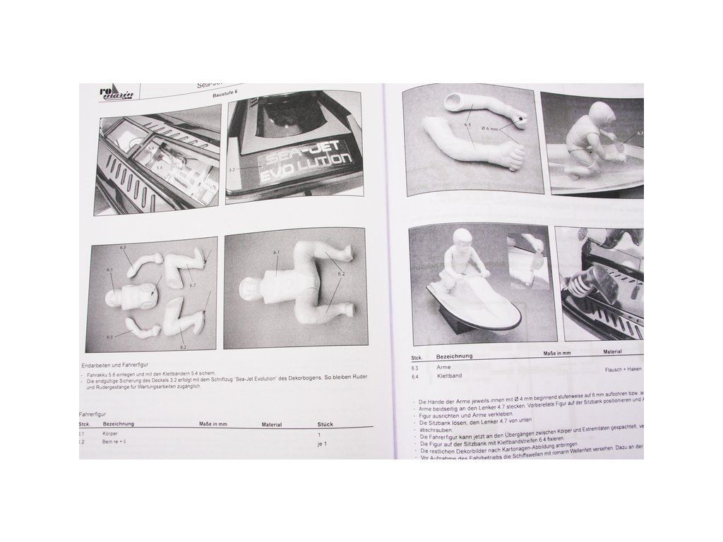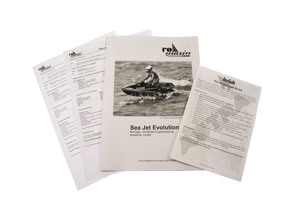 Stavebnice modelu lodi ROMARIN, Sea-Jet Evolution, obsahuje plastové výlisky trupu, paluby, lasesem vyřezané součásti v ABS desce, součásti figurky, díly stojánku a vnitřní konstrukce, montážní součásti, návod k sestavení, manuál v angličtině, němčině, francouzštině EN, DE, FR.