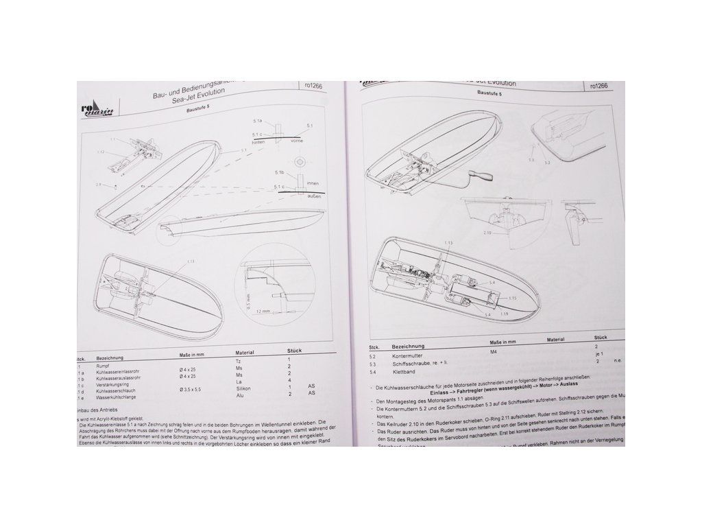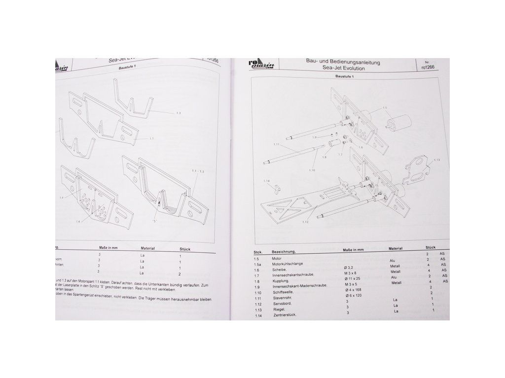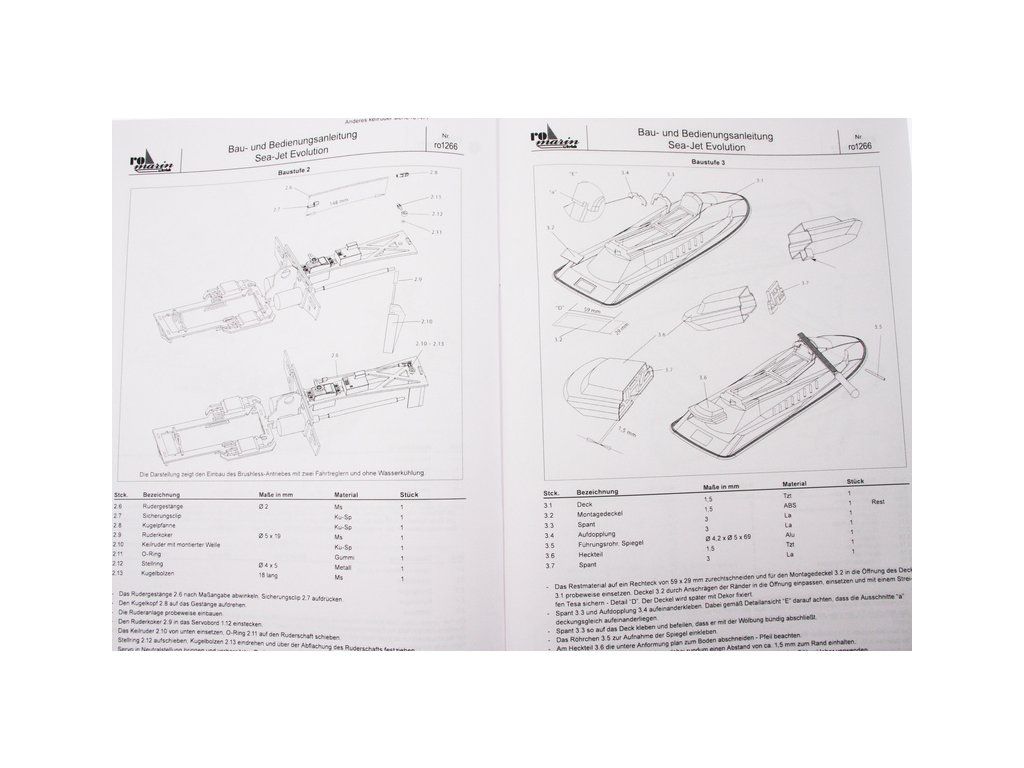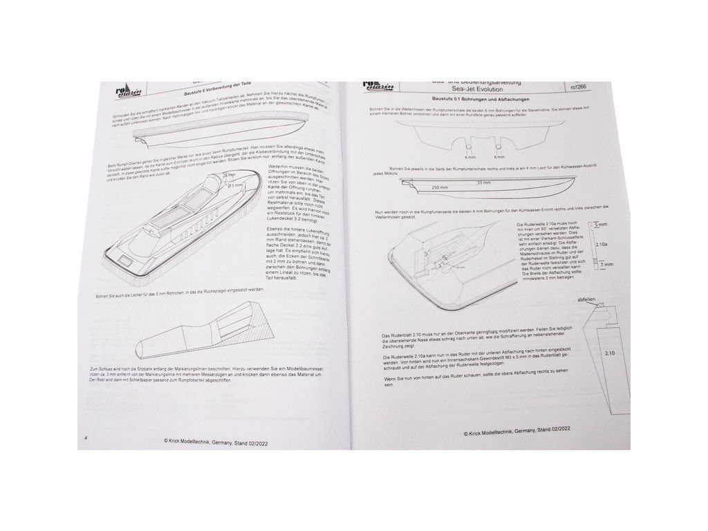 Stavebnice modelu lodi ROMARIN, Sea-Jet Evolution, obsahuje plastové výlisky trupu, paluby, lasesem vyřezané součásti v ABS desce, součásti figurky, díly stojánku a vnitřní konstrukce, montážní součásti, návod k sestavení, manuál v angličtině, němčině, francouzštině EN, DE, FR.