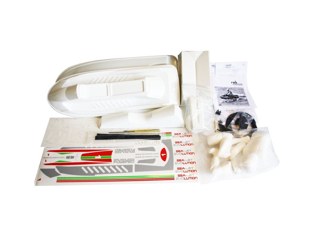 Stavebnice RC modelu vodního skútru ROMARIN Sea-Jet Evolution kit pro začínající i pokročilé lodní modeláře. Délka 685 mm, trup a paluba z teplem tvářeného plastu ABS, CNC obráběné ABS díly pro pohon a instalaci RC. K pohonu jsou doporučeny 2 ks střídavé motory 28-4507.
