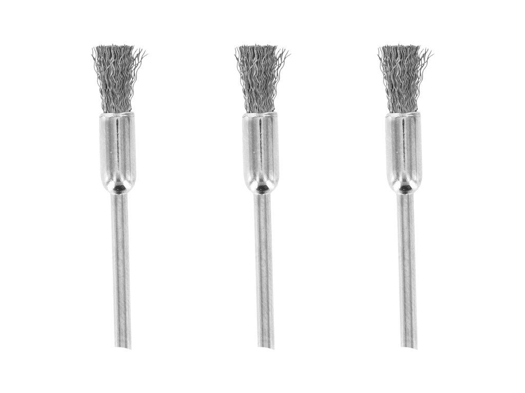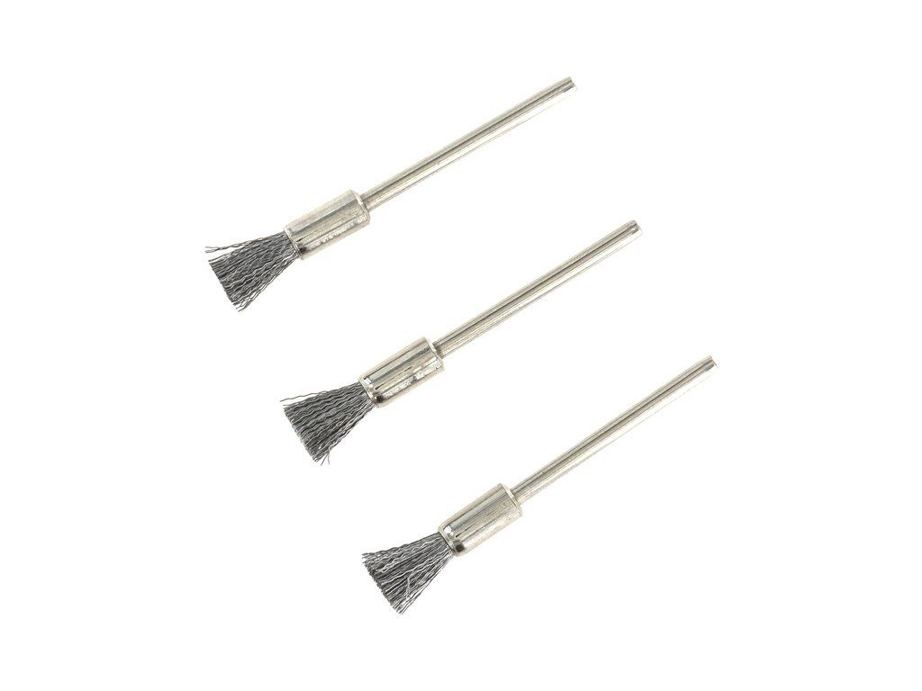 Rotacraft stopkový drátěný kartáč ocelový (3ks v balení) je určen pro šetrné čištění kovu, plastu, skla, keramiky, kamene, opravy apod. Stopka do kleštiny 2,35mm, průměr cca 5mm.