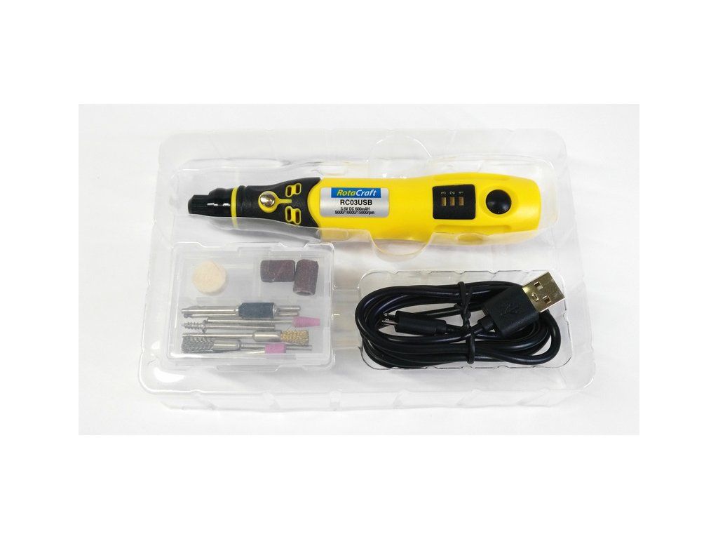 Rotacraft vrtací frézka RC03 se 12 nástroji a integrovanou baterií LiIon 3,6 V. Lehká frézka do ruky má troje otáčky: 5000/10000/15000ot/min, kleštinu 2,3 mm a k dispozici 12 ks rotačních nástrojů. Ideální pro přesné, složité práce rytí, broušení, leštění apod.