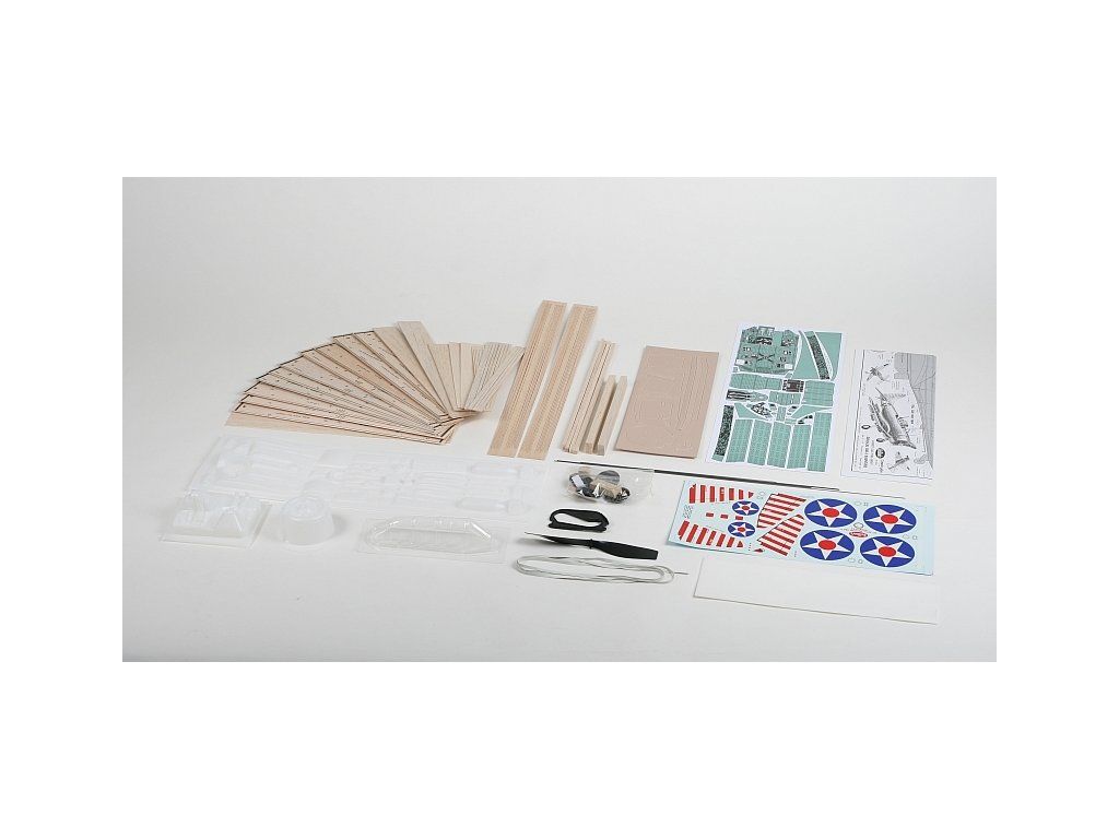 Stavebnice obsahuje: balsové předseknuté díly, balsové nosníky, předseknuté díly z plastikové překližky, vakuově lisované maketové díly (kryt motoru, motor...), čirý acetátový výlisek krytu kabiny, plastovou vrtuli s hřídelí a hlavicí, gumový svazek (guma 5x1mm), ocelovou strunu na podvozek a další drobné díly, plastová kola, potahový papír, rukojeť a vahadlo pro upoutaný model, velký aršík mokrých obtisků, stavební plán.