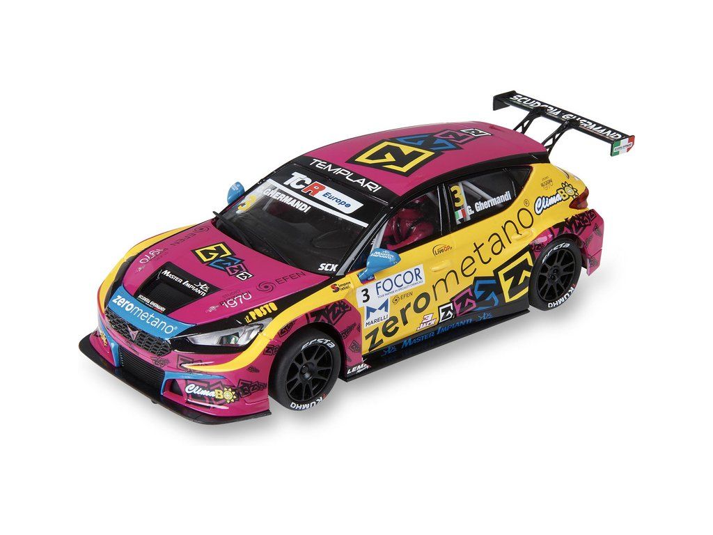 Dráhové autíčko SCX Advance Cupra León Competición Zero Metano v měřítku 1:32, s osvětlením pro digitální autodráhy SCX Advance. Verze 2.0.