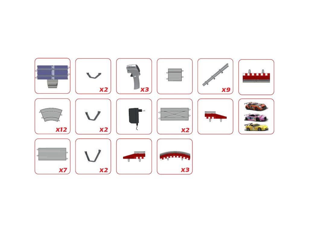 Balení obsahuje traťové díly, most, 2x křížení, svodidla, krajnice s mantinely, Bluetooth napájecí rovinku, 3x dráhové autíčko, 3x ovladač a napájecí zdroj. Návod CZ.