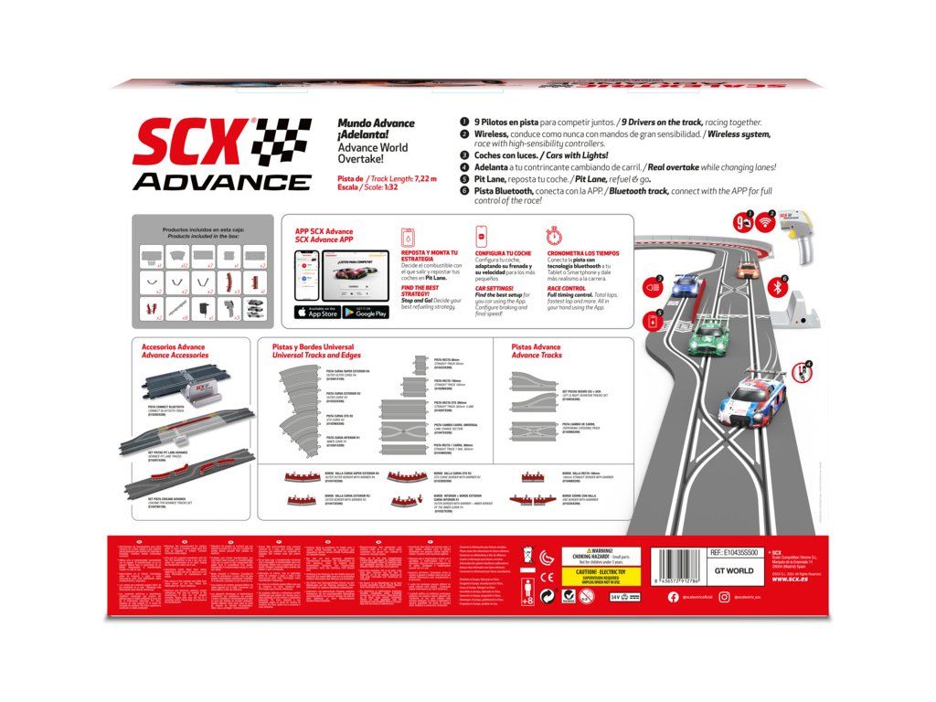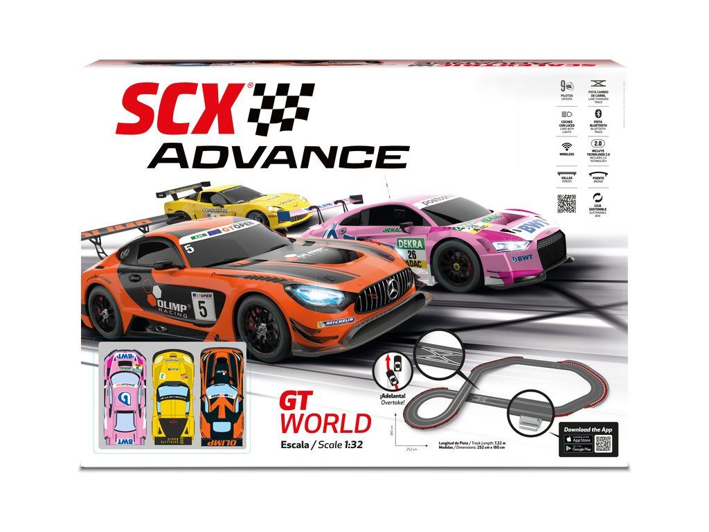 SCX Advance GT World 2.0 v klasickém měřítku 1:32 - vynikající digitální elektrická autodráha s předjížděním v křížení, Bluetooth rovinkou, mostem, svodidly a mantinely. Tři bezdrátové ovladače s přepínačem výhybky, tři digitální dráhová autíčka s LED světly. Plocha pro rozložení: 252 x 180 cm. Délka tratě: 7,22 m.