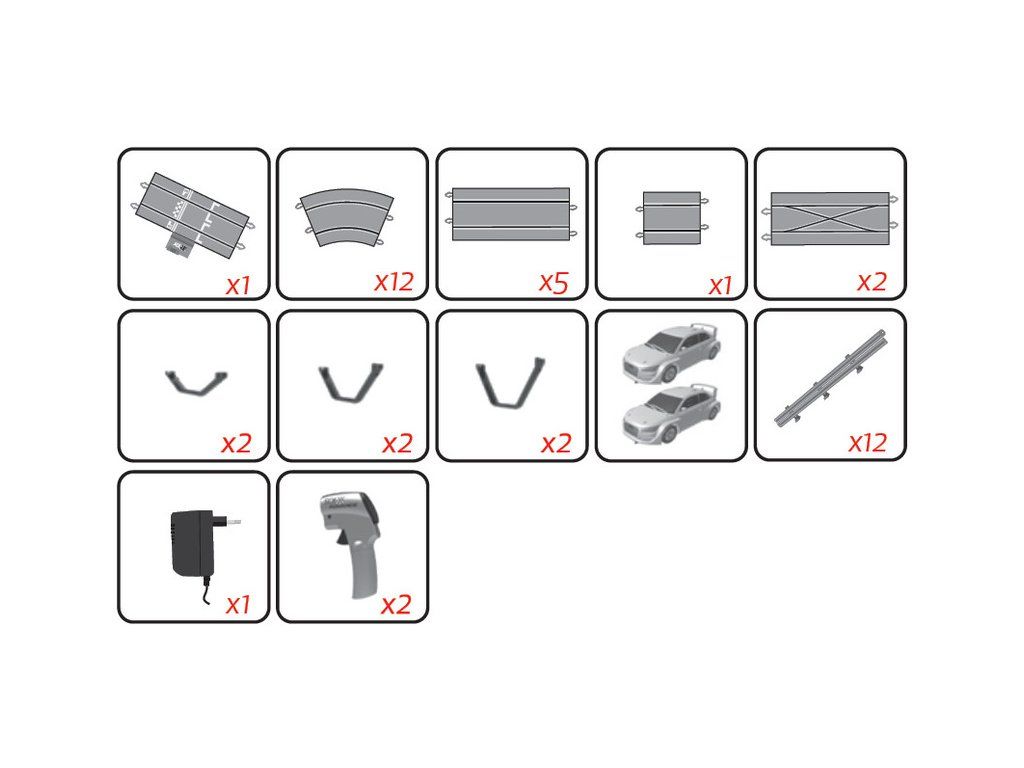 Balení obsahuje traťové díly, most, 2x křížení, svodidla, 2x dráhové autíčko, 2x ovladač a napájecí zdroj. Návod CZ a manuál EN, ES, FR, PT, DE, NL, IT, RU.
