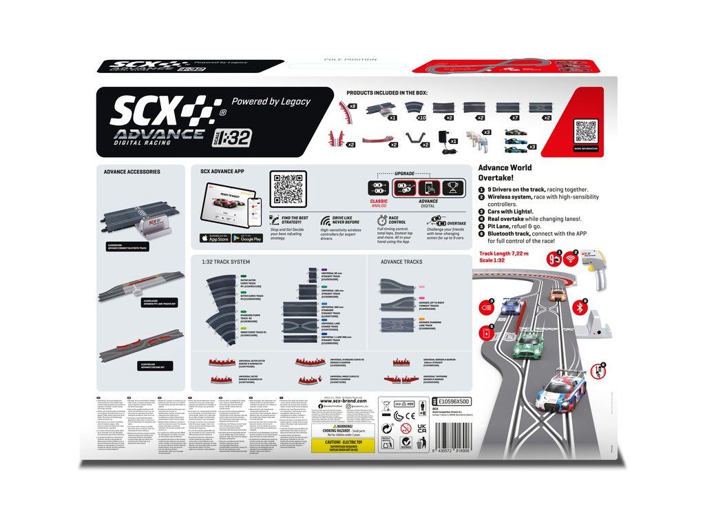 SCX Advance Pole Position 2.0 v klasickém měřítku 1:32 - vynikající digitální elektrická autodráha s předjížděním v křížení, Bluetooth rovinkou, mostem, svodidly a mantinely. Tři bezdrátové ovladače s přepínačem výhybky, tři digitální dráhová autíčka s LED světly. Plocha pro rozložení: 252 x 180 cm. Délka tratě: 7,22 m.