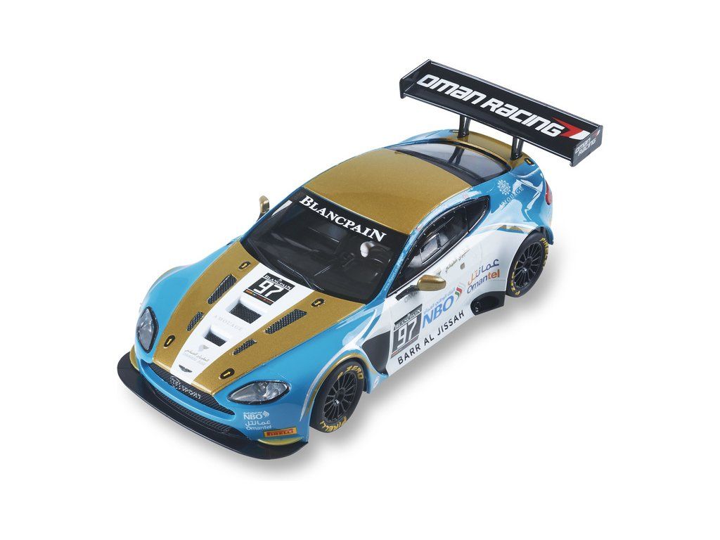 Dráhové autíčko SCX Classic Aston Martin Vantage GT3 NBO v měřítku 1:32, s osvětlením, pro analogové autodráhy SCX Classic. Pokud doplníte SCX Advance Konverzní sada typ A - dlouhý SCXE10405X200, můžete auto použít pro autodráhu Advance.