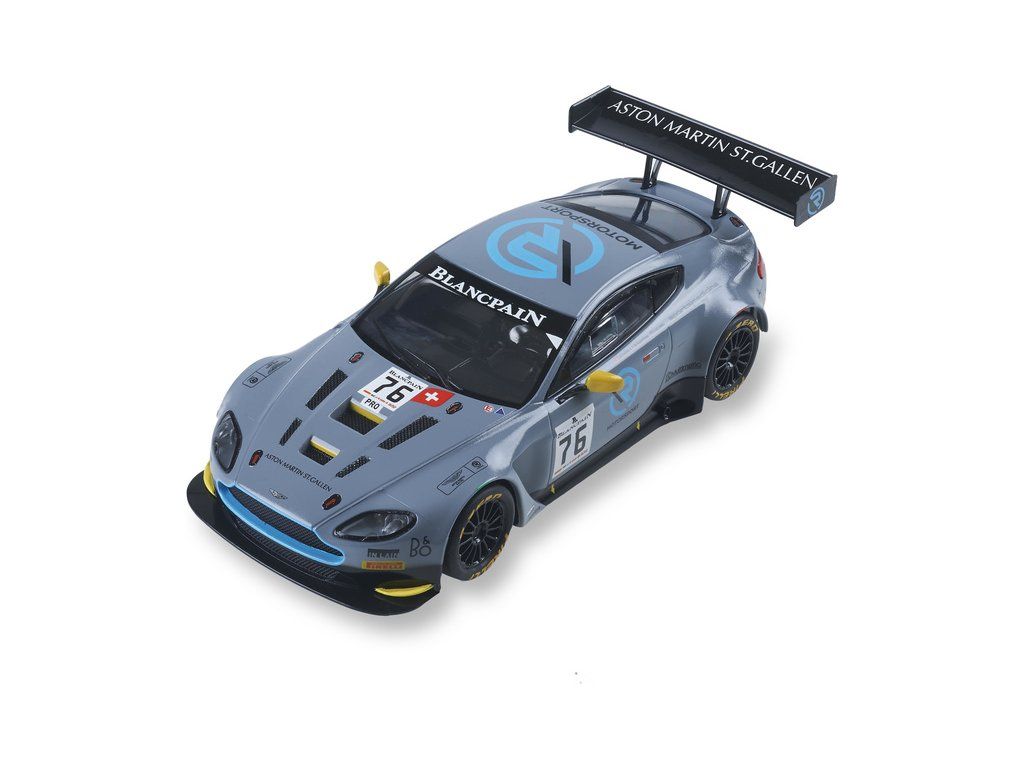 Dráhové autíčko SCX Classic Aston Martin Vantage GT3 St. Gallen v měřítku 1:32, s osvětlením, pro analogové autodráhy SCX Classic. Pokud doplníte SCX Advance Konverzní sada typ A - dlouhý SCXE10405X200, můžete auto použít pro autodráhu Advance.