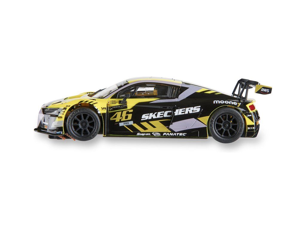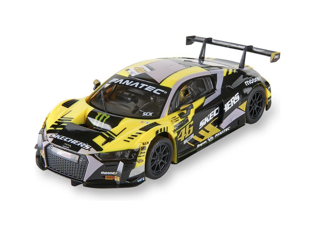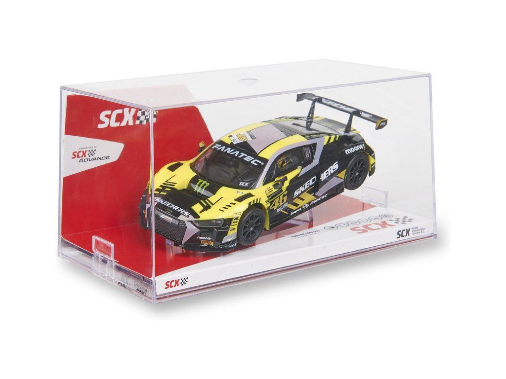 Dráhové autíčko SCX Classic Audi R8 LMS VR46 v měřítku 1:32, s osvětlením, pro analogové autodráhy SCX Classic. Pokud doplníte SCX Advance Konverzní sada typ A - dlouhý SCXE10405X200, můžete auto použít pro autodráhu Advance.