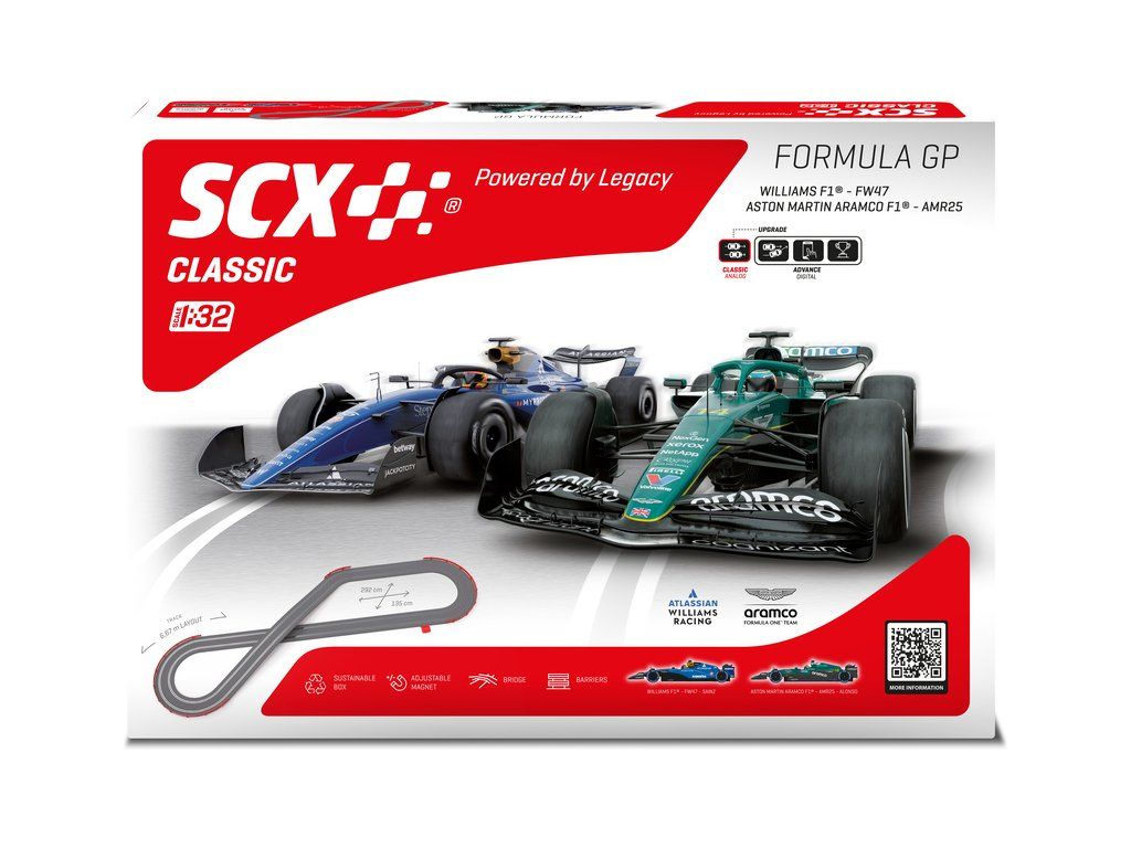 Autodráha SCX Formula GP v klasické měřítku 1:32 pro napínavější závody - analogová elektrická autodráha s mostem a svodidly. Dva ergonomické ovladače, dvě detailně zpracovaná dráhová autíčka Aston Martin F1 Alonso a Williams F1 Sainz. Plocha pro rozložení: 292 x 135 cm. Délka tratě: 6,67 m.