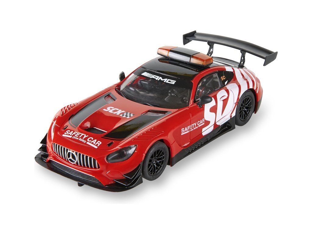 Dráhové autíčko SCX Classic Mercedes AMG GT3 Safety v měřítku 1:32, s osvětlením, pro analogové autodráhy SCX Classic. Pokud doplníte SCX Advance Konverzní sada typ A - dlouhý SCXE10405X200, můžete auto použít pro autodráhu Advance.
