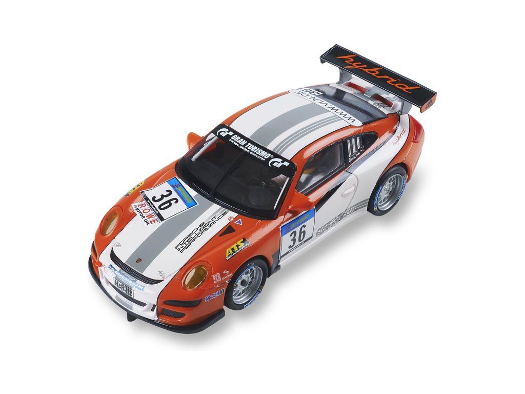 Dráhové autíčko SCX Classic Porsche 911 Hybrid v měřítku 1:32, s osvětlením, pro analogové autodráhy SCX Classic. Pokud doplníte SCX Advance Konverzní sada typ A - dlouhý SCXE10405X200, můžete auto použít pro autodráhu Advance.