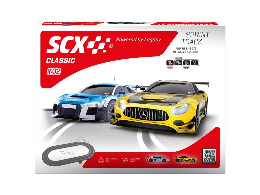 Autodráha SCX Classic Sprint Track v klasické měřítku 1:32 pro napínavější závody - analogová elektrická autodráha ve tvaru oválu. Dva ergonomické ovladače, dvě detailně zpracovaná dráhová autíčka Mercedes AMG GT3 a Audi R8 MS. Plocha pro rozložení: 148 cm x 83 cm. Délka tratě: 3,2 m.
