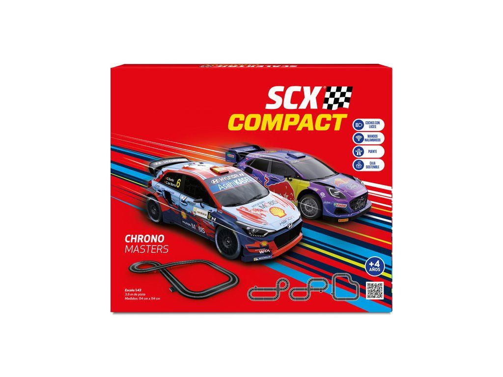 Elektrická autodráha SCX Compact Chrono Masters v měřítku 1:43 - analogová autodráha s rovinkami, zatáčkami a mostem. Dva bezdrátové ovladače, dvě detailní dráhová autíčka se světly, Ford a Hyundai. Plocha pro rozložení: 114 x 114 cm. Délka tratě: 3,66 m.