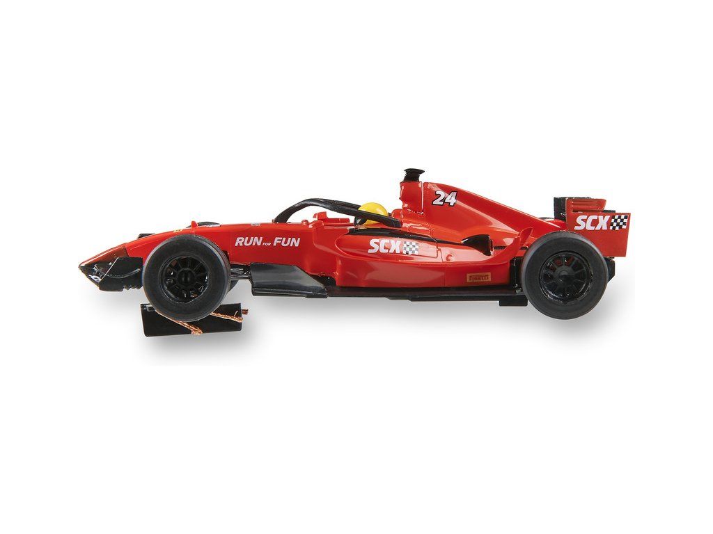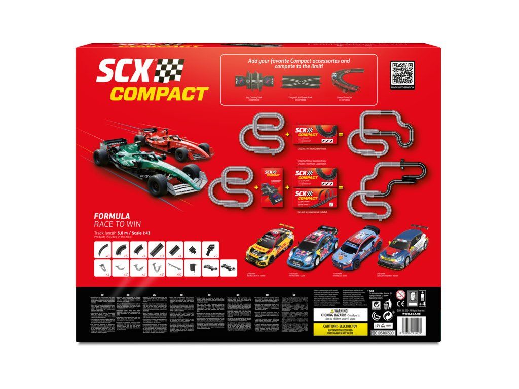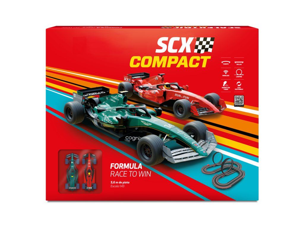 Elektrická autodráha SCX Compact Formula Race to Win v měřítku 1:43 - analogová autodráha s rovinkami, zatáčkami, mostem, svodidly a loopingem. Dva bezdrátové ovladače, dvě detailně zpracované dráhové formule F. Plocha pro rozložení základní varianty: 114 x 107 cm. Délka tratě: 5,6 m.