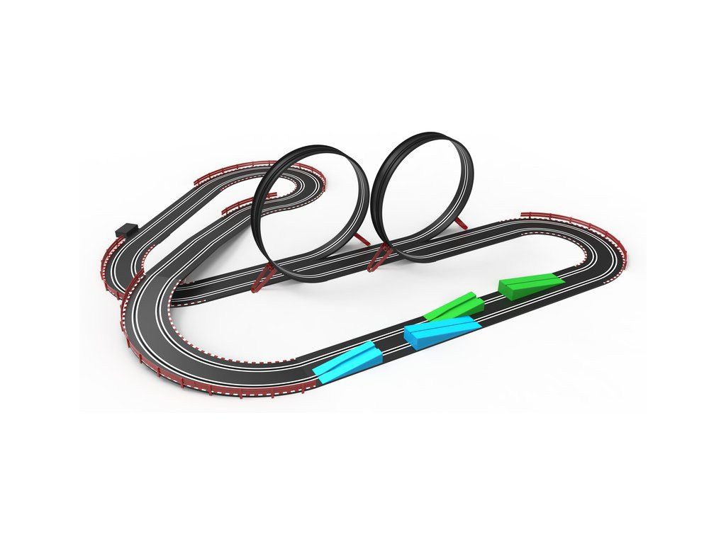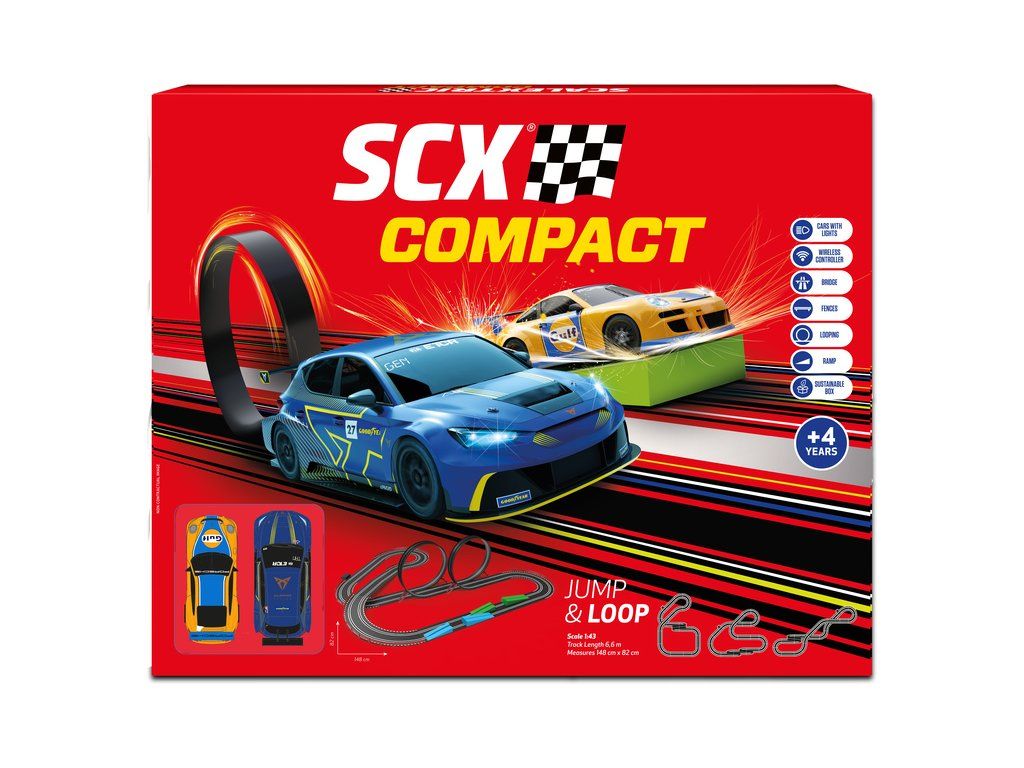 Elektrická autodráha SCX Compact Jump & Loop v měřítku 1:43 - analogová autodráha s mostem, svodidly, loopingem a skokánky. Dva bezdrátové ovladače, dvě detailní dráhová autíčka se světly, Porsche a Cupra. Plocha pro rozložení: 148 x 82 cm. Délka tratě: 6,6 m.