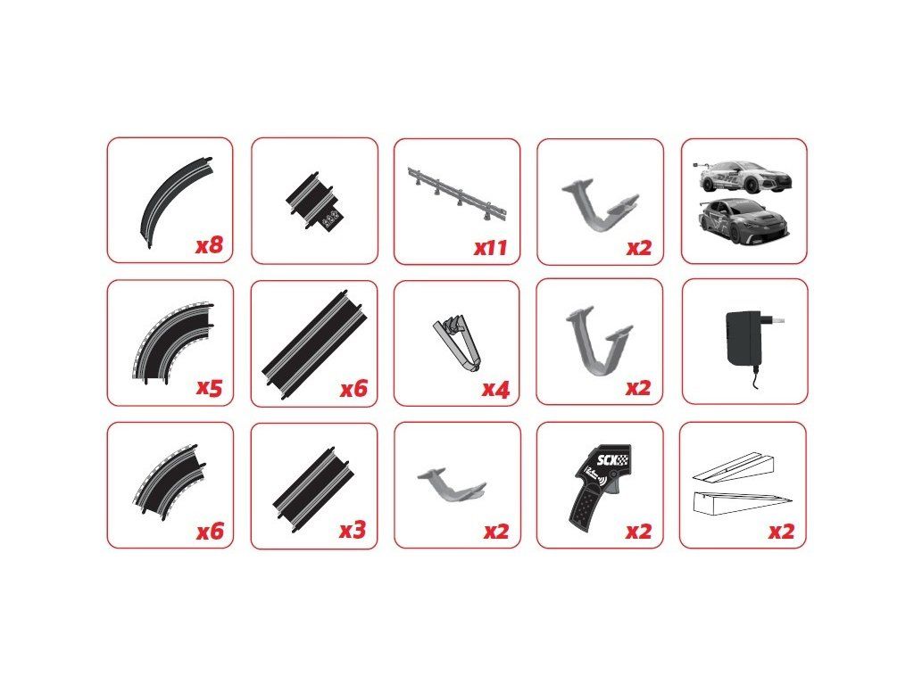 Balení obsahuje traťové díly, most, svodidla, dvojitý looping, 2x skokánek, 2x dráhové autíčko, 2x ovladač a napájecí zdroj.
