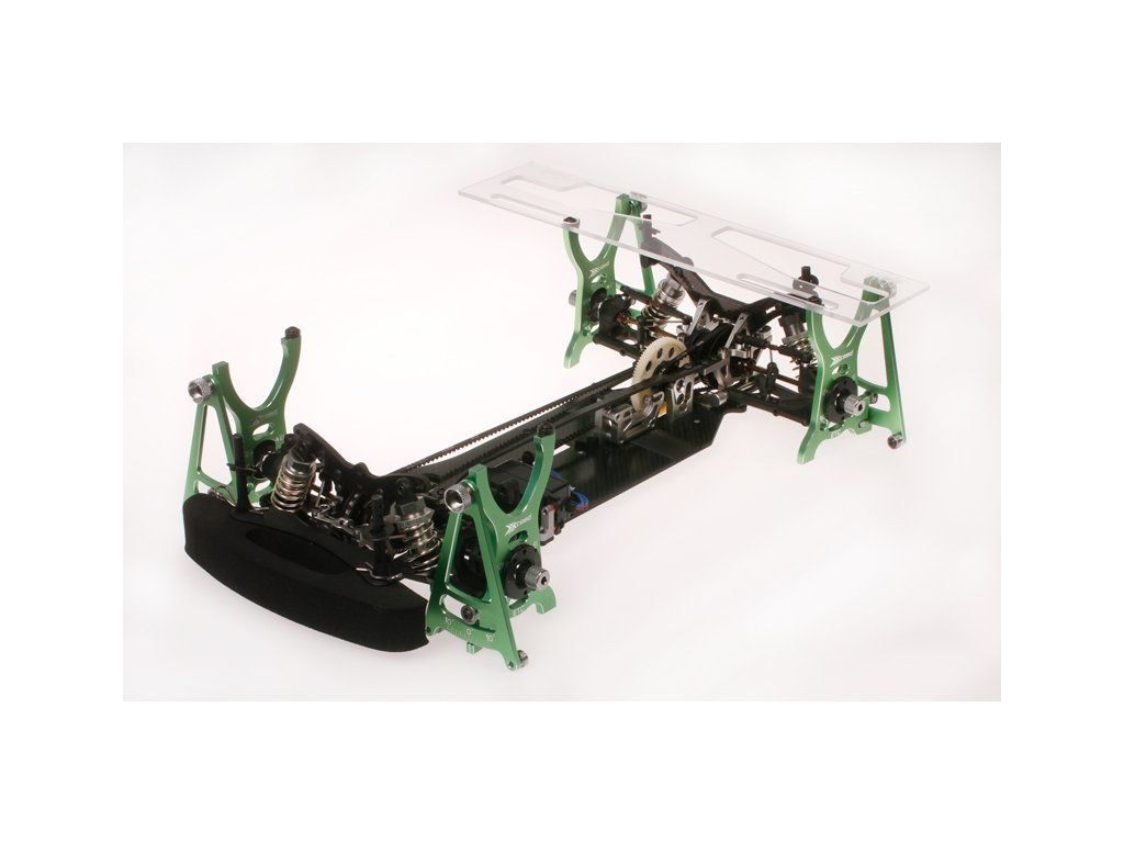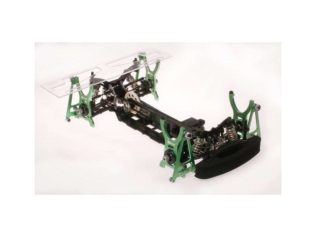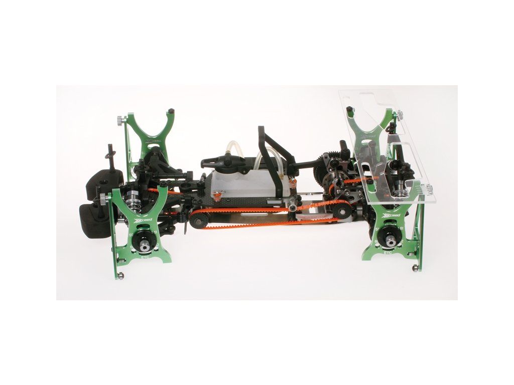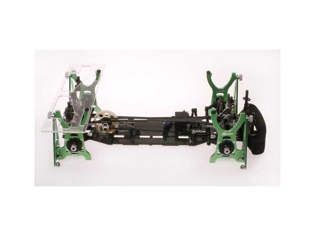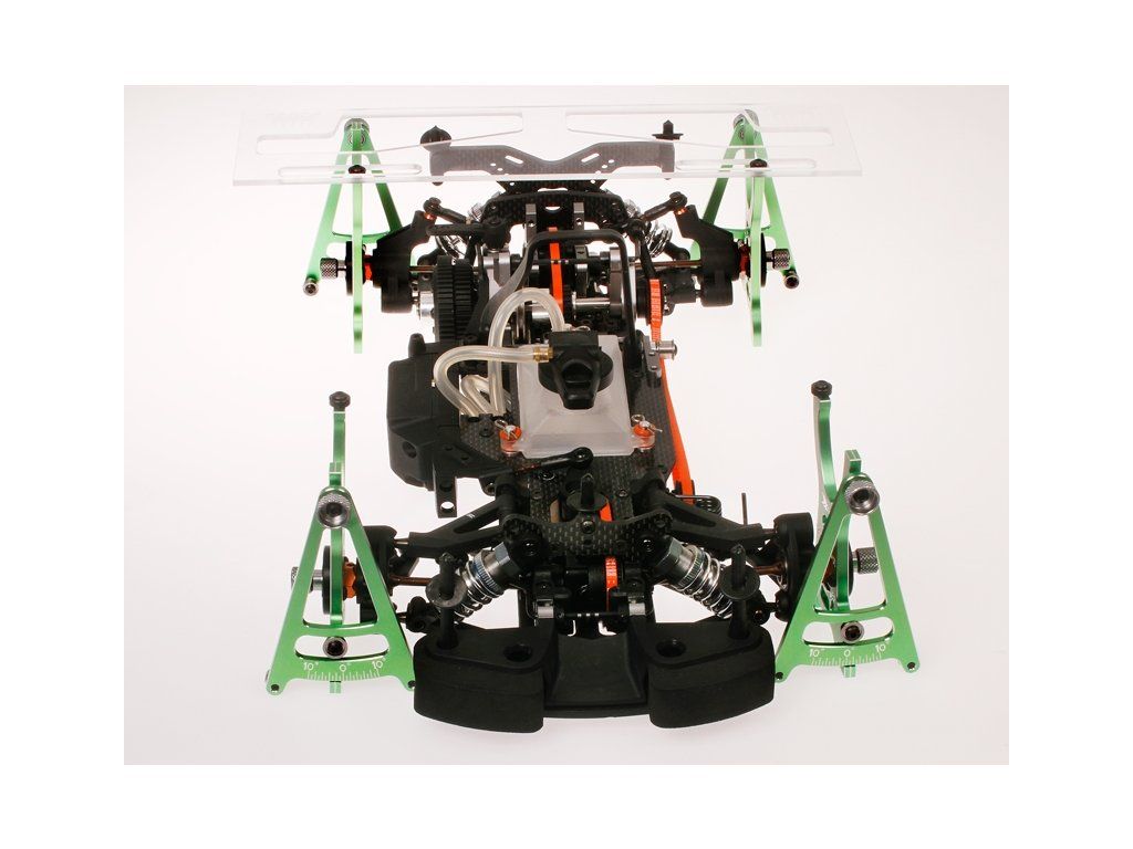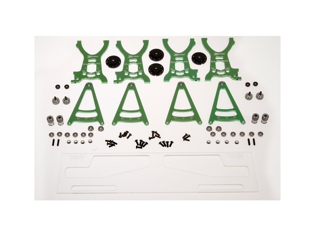 Systém nastavení pro RC aut v měřítku 1/10. Zahrnuje - Přesně opracované hliníkové držáky ve studené zelené eloxaci - Vroubkované matice pro snadnou a rychlou montáž kol - Vysoce kvalitní spojovací prvky - Obráběné nylonové výstředníky pro průměr pneumatiky - Plně uložené v kuličkových ložiskách - Přesné gravírování a značení - Polykarbonátová horní deska - Praktický úložný vak