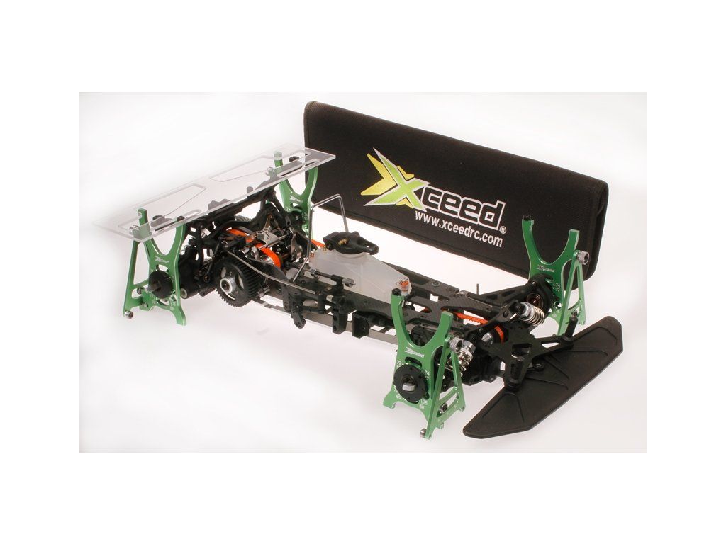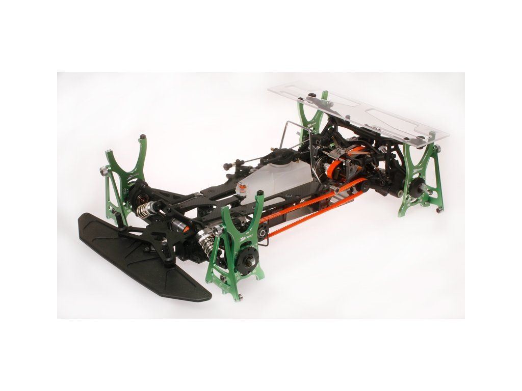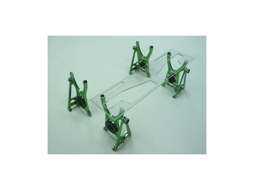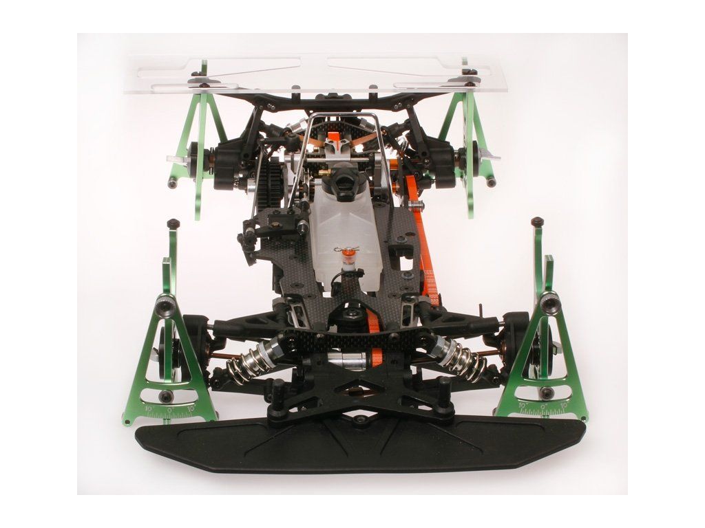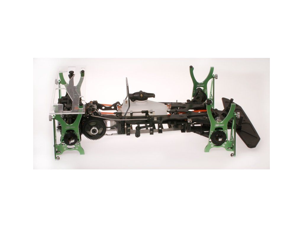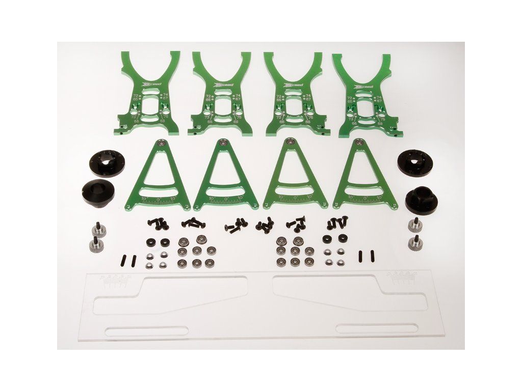 Systém nastavení pro RC aut v měřítku 1/10. Zahrnuje - Přesně opracované hliníkové držáky ve studené zelené eloxaci - Vroubkované matice pro snadnou a rychlou montáž kol - Vysoce kvalitní spojovací prvky - Obráběné nylonové výstředníky pro průměr pneumatiky - Plně uložené v kuličkových ložiskách - Přesné gravírování a značení - Polykarbonátová horní deska - Praktický úložný vak