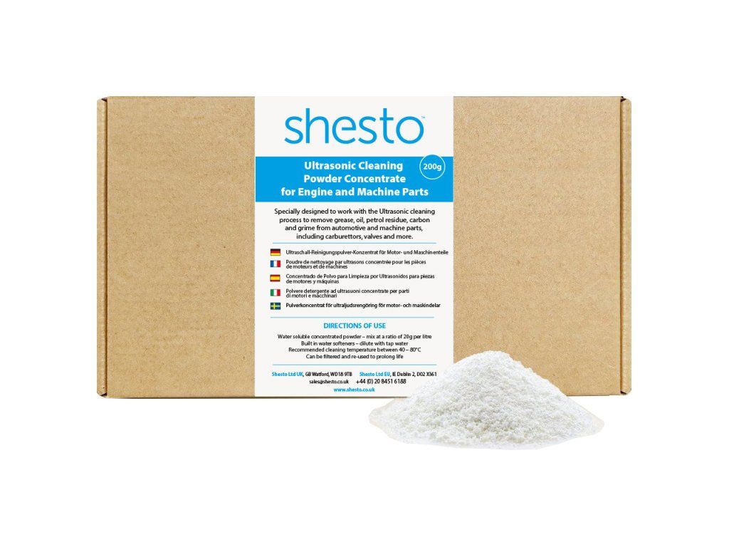 Speciálně navržený rozpustný koncentrovaný prášek pro ultrazvukové čištění k odstranění mastnoty, oleje, zbytků benzínu, uhlíku a nečistot z automobilových a strojních dílů, včetně karburátorů, ventilů a dalších. Vytvoření až 10 l roztoku z 200g koncentrátu.