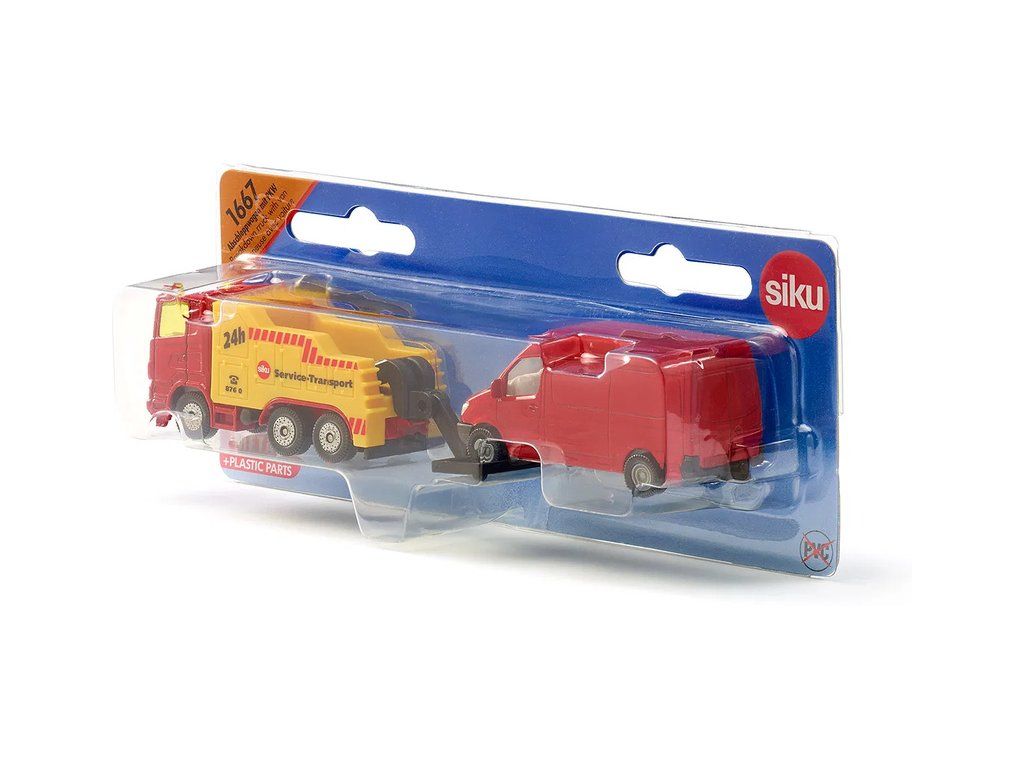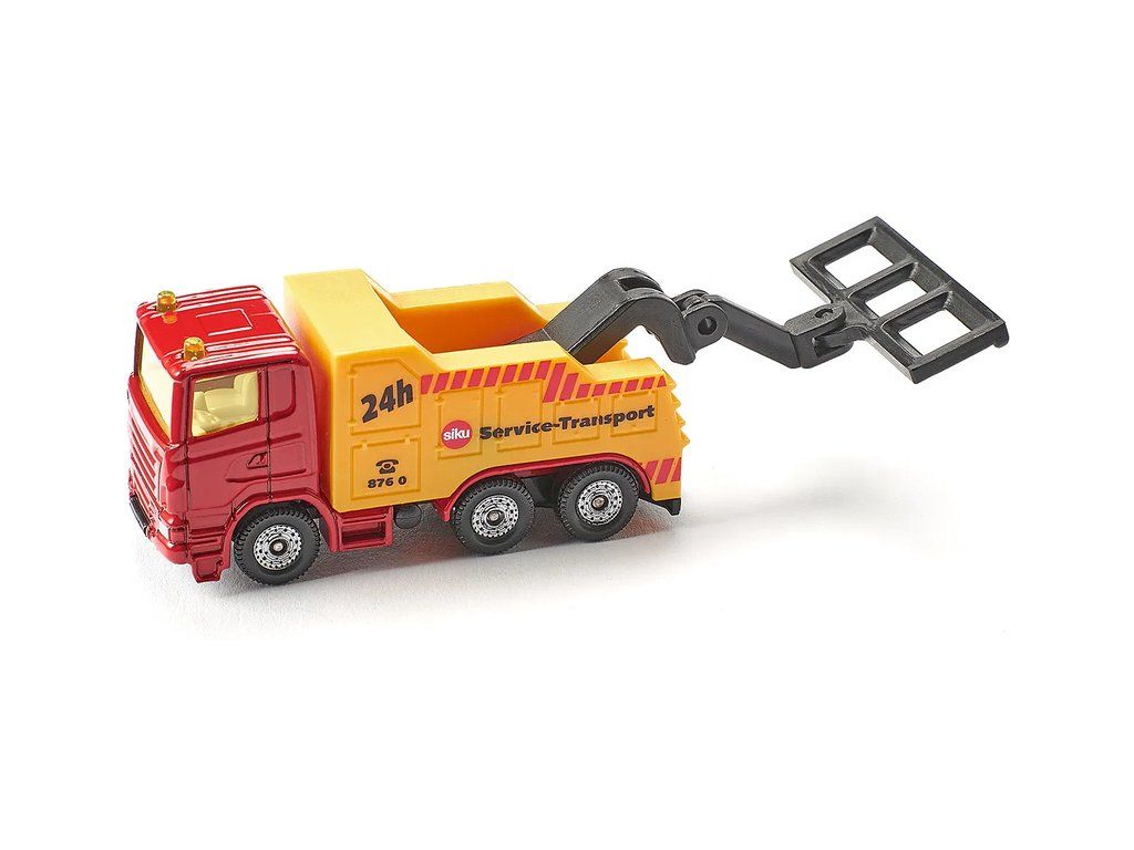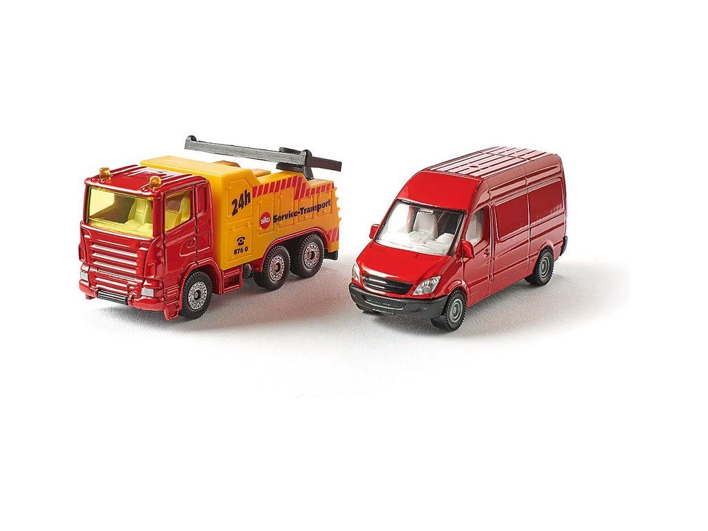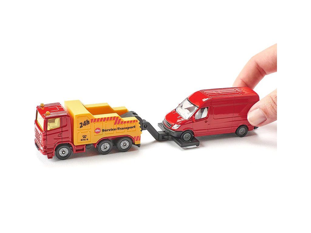 Kovový model odtahového auta s dodávkou, délka přibližně 18 cm, měřítko 1:87. Odtahové vozidlo má čirá okna, majáčky a sklopné nastavitelné rameno. Dodávka obsahuje rovněž čirá okna a zpracovaný interiér. Vhodné pro hraní i sběratelství. Kvalitní zpracování z kovu a plastu. Baleno v blistru.