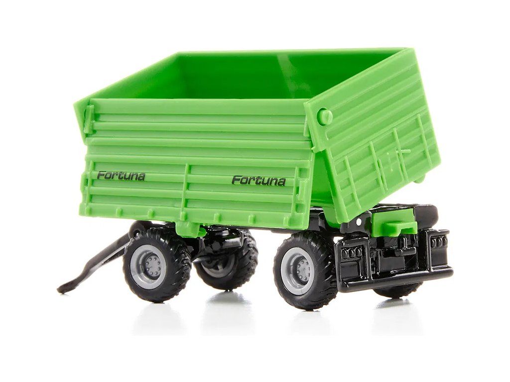Kovový model traktoru DEUTZ-FAHR s vlečkou Fortuna, délka přibližně 17 cm, měřítko 1:87. Traktor je vybaven tažným zařízením a odnímatelnou střechou. Vlečka je odpojitelná, má otočnou přední nápravu, vyklápěcí krobu do strany a otevírací boční čelo. Vhodné pro hraní i sběratelství. Kvalitní zpracování z kovu a plastu. Baleno v blistru.