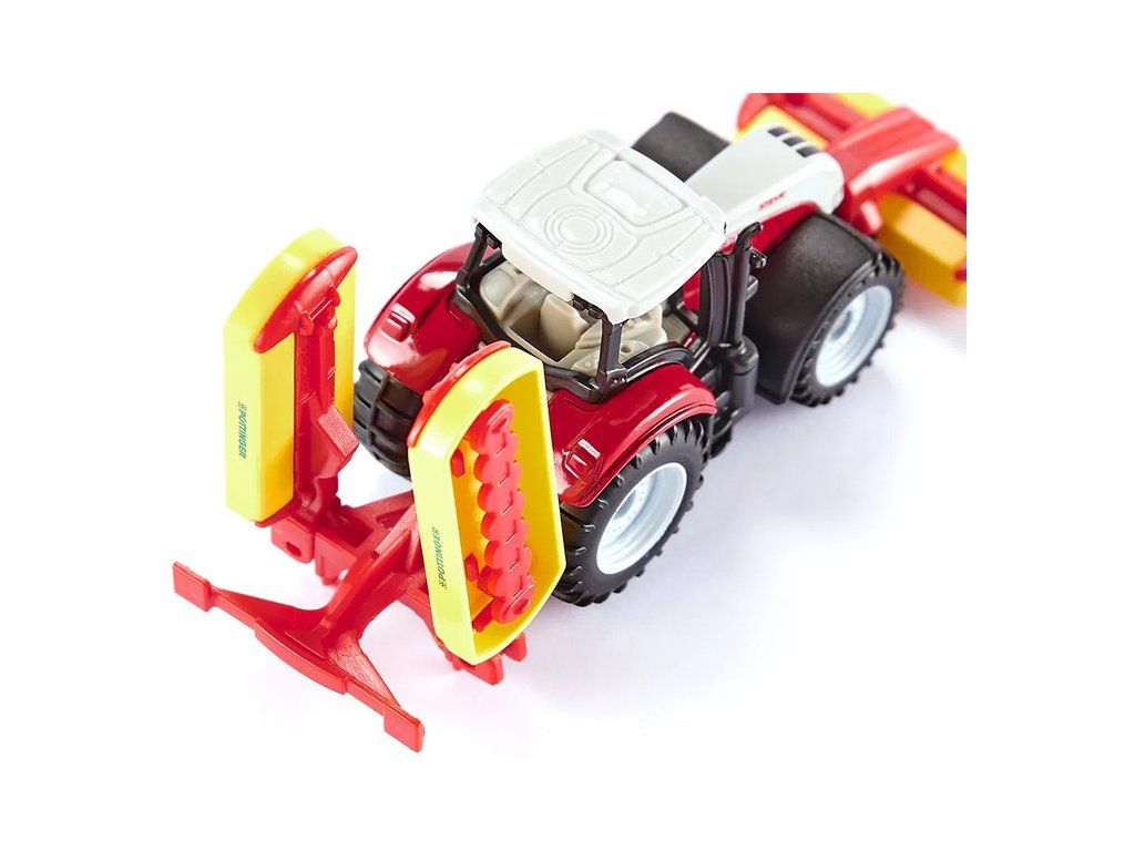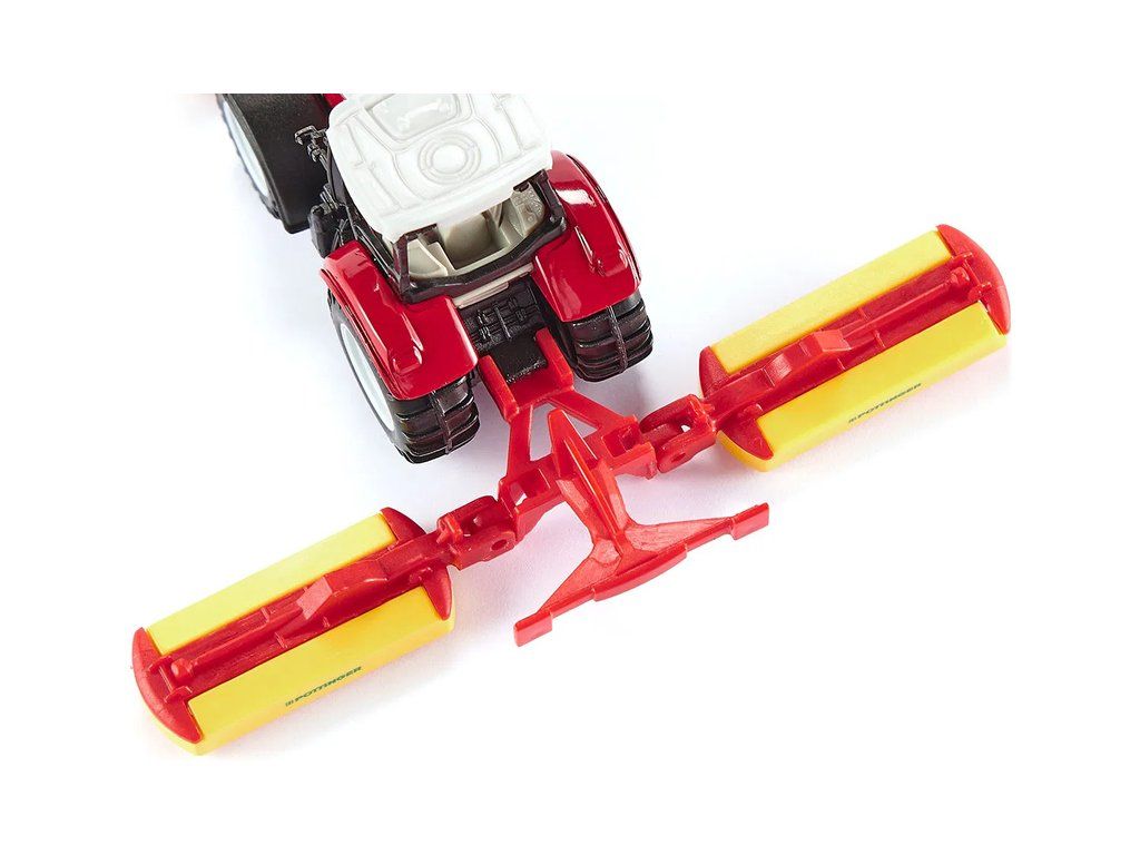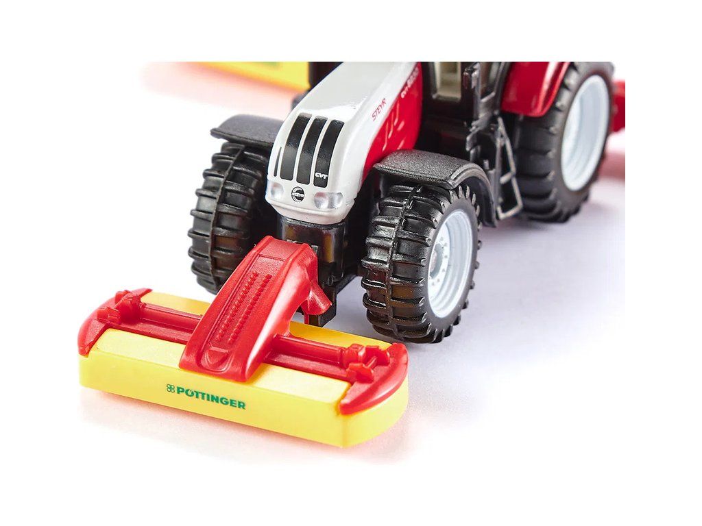 Kovový model traktoru Steyr s žacími lištami Pöttinger, délka přibližně 11 cm, měřítko 1:87. Traktor je vybaven tažným zařízením, odnímatelnou střechou, přední a zadní odnímatelnou žací lištou. Zadní ramena jsou sklopná. Vhodné pro hraní i sběratelství. Kvalitní zpracování z kovu a plastu. Baleno v blistru.