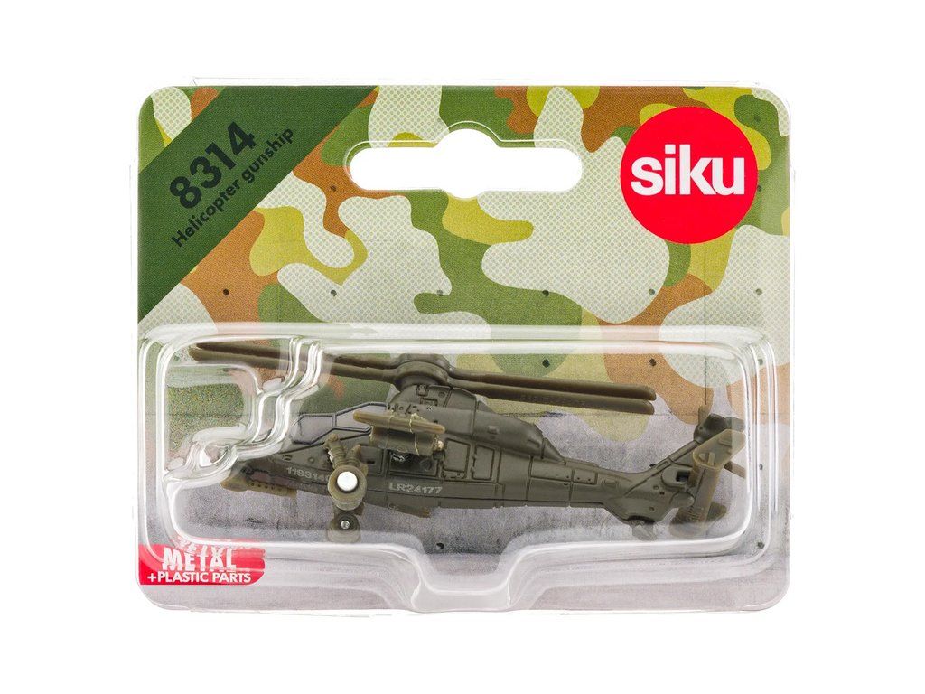 Kovový model bojového vrtulníku od značky Siku. Vrtulník má otočné vrtule hlavního i ocasního rotoru a je vybaven maketami závěsných střel a předního kulometu. Vhodné pro hraní i sběratelství. Kvalitní zpracování z kovu a plastu. Baleno v blistru.