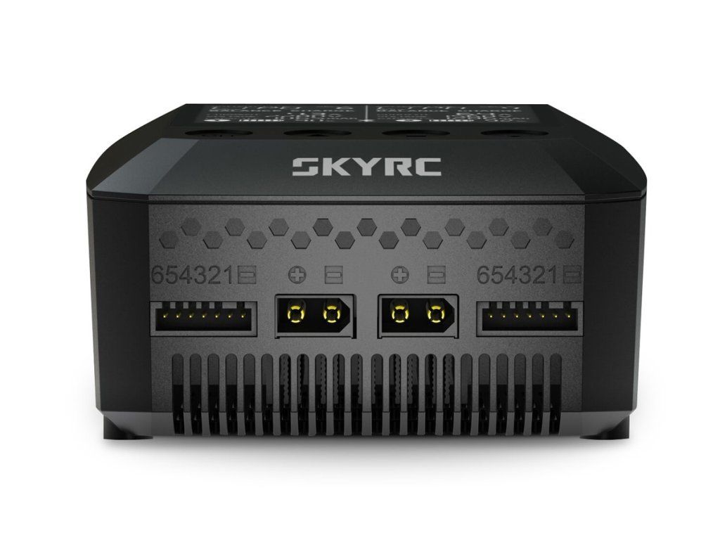 Nabíječ je v obou kanálech vybaven výstupními zásuvkami XT60 a univerzálními zásuvkami pro servisní konektory JST-XH umožňující přímo zapojit silové kabely akumulátoru a servisní konektory JST-XH sad 2-6S – pokud používáte sady s konektory XT60 a JST-XH, obejdete se zcela bez nabíjecích kabelů a adaptérů. Pro připojení servisních konektorů jiných systémů můžete použít standardní adaptéry Sky RC nebo RC System.