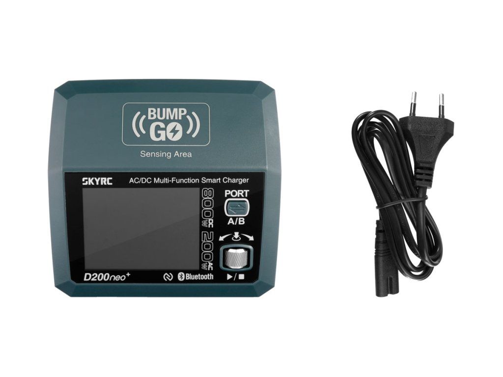Dvoukanálový nabíječ SKY RC D200neo+ 800W byl konstruován se snahou poskytnout vše potřebné pro nabíjení dvou akumulátorů velkými proudy současně „pod jednou střechou" včetně síťového zdroje, s jednoduchou obsluhou a možností komunikace s aplikací SkyCharger. D200neo+ umožňuje nabíjet a vybíjet běžné typy článků (NiCd, NiMH, Li-poly, Li-ion, Li-Fe, Li-HV, Pb), navíc jsou oba kanály vybaveny vestavěnými šestikanálovými balancery, které zajišťují velmi bezpečné a komfortní nabíjení lithiových akumulátorů. Může také pracovat v režimu paralelního nabíjení, kdy oba kanály nabíjejí jeden akumulátor proudem 20-35 A. Při připojení externího vybíječe BD350 potom umožňuje vybíjení proudem až 40 A při max výkonu 350 W.