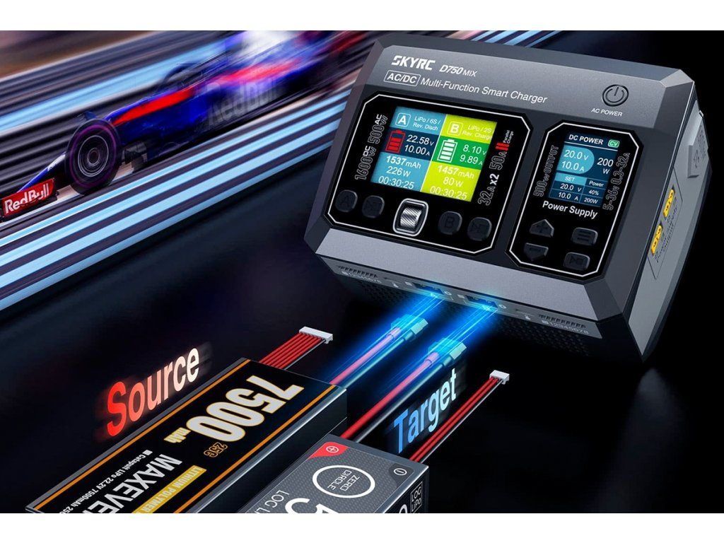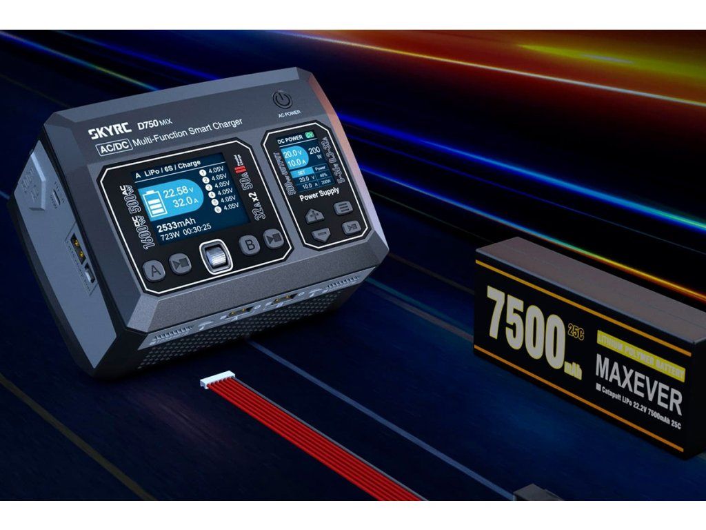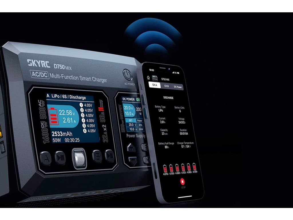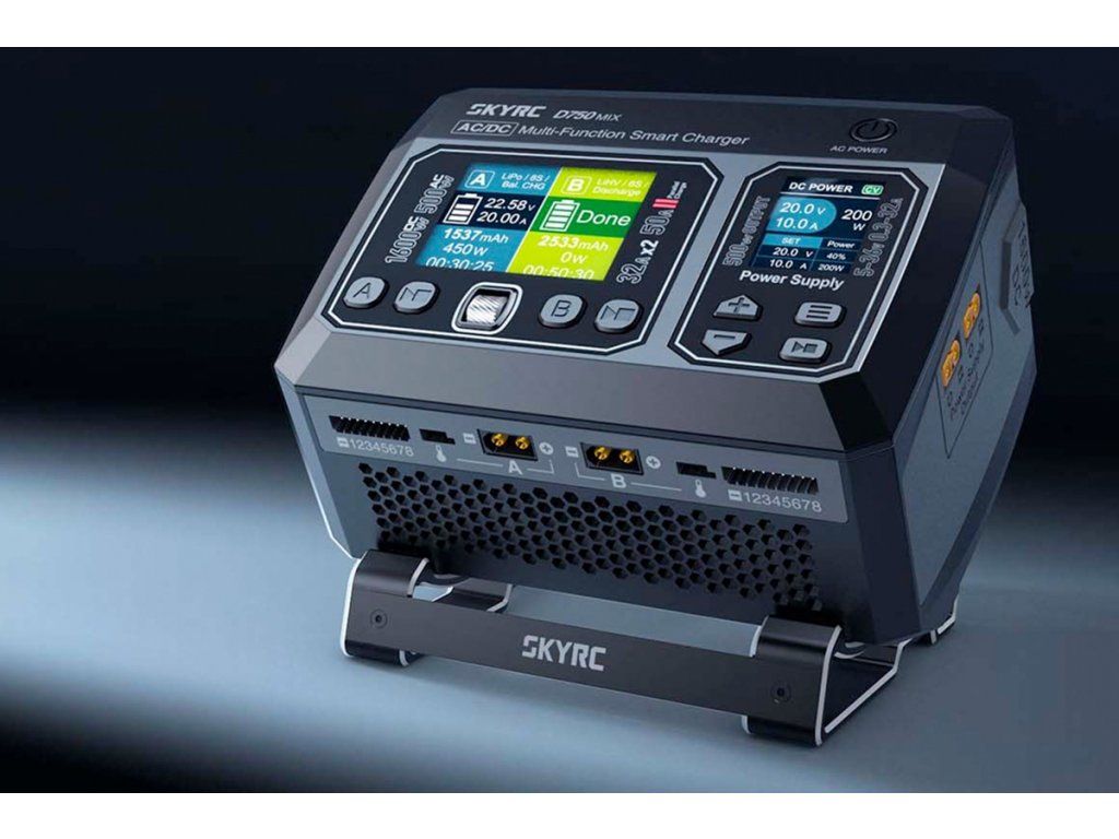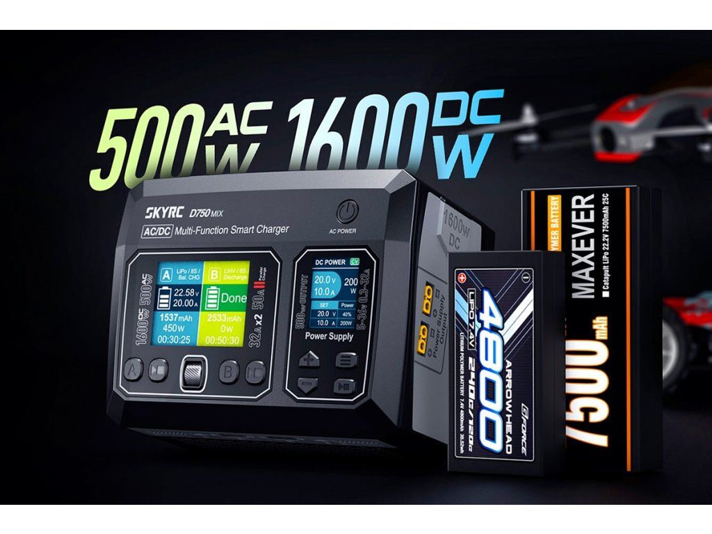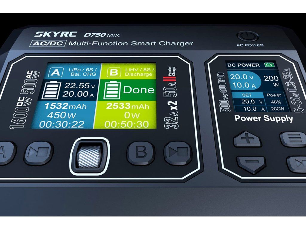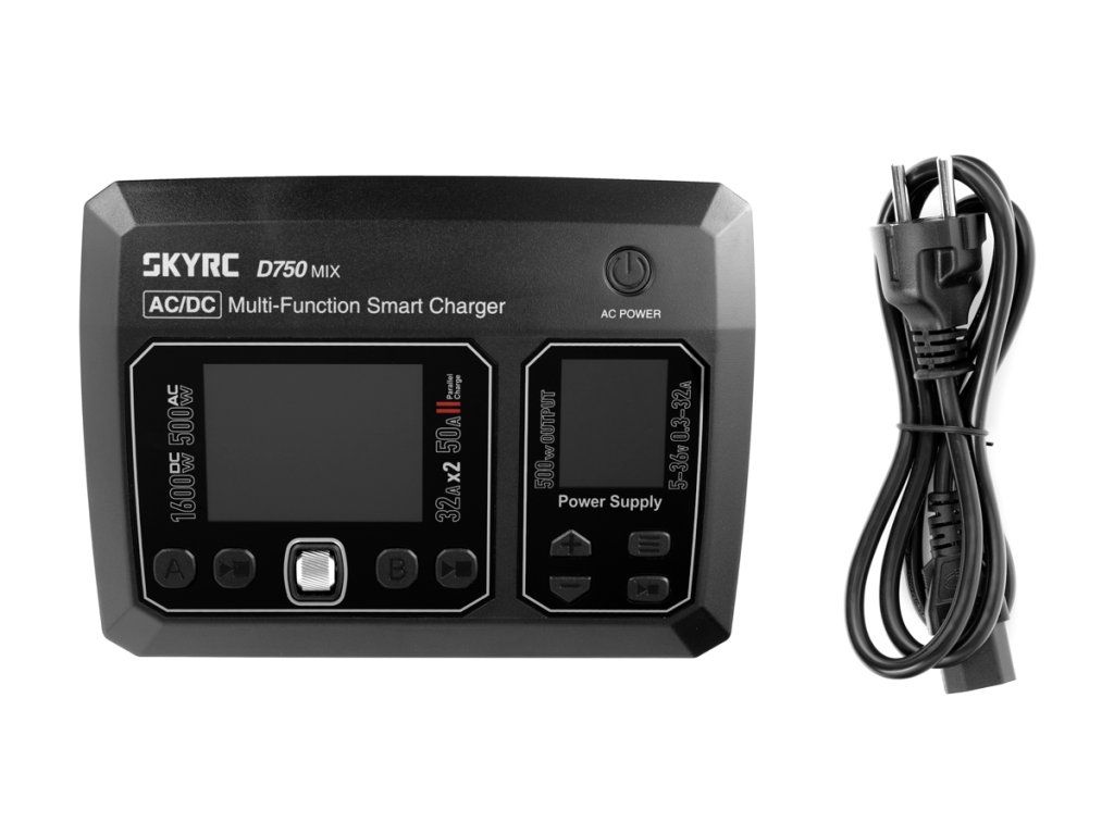 Dvoukanálový nabíječ SKY RC D750 MIX 1600W byl konstruován se snahou poskytnout vše potřebné pro nabíjení dvou akumulátorů s vyšším počtem článků velkými proudy současně „pod jednou střechou" včetně síťového zdroje, s jednoduchou obsluhou a možností komunikace s aplikací SkyCharger. D750 MIX umožňuje nabíjet a vybíjet běžné typy článků (NiCd, NiMH, Li-poly, Li-ion, Li-Fe, Li-HV, Pb), navíc jsou oba kanály vybaveny vestavěnými osmikanálovými balancery, které zajišťují velmi bezpečné a komfortní nabíjení lithiových akumulátorů. Může také pracovat v režimu paralelního nabíjení, kdy oba kanály nabíjejí jeden akumulátor proudem 33-50 A. Při připojení externího vybíječe BD350 nebo BD380 potom umožňuje vybíjení proudem až 40 A při max výkonu 350 W a nabízí také režim rekuperačního vybíjení s výkonem až 1100 W. Kromě nabíječe D750 MIX má také vestavěný stabilizovaný napájecí zdroj s nastavitelným výstupním napětím 5-36 V a proudem 0,3-32 A s vlastním displejem a nastavovacími tlačítky.