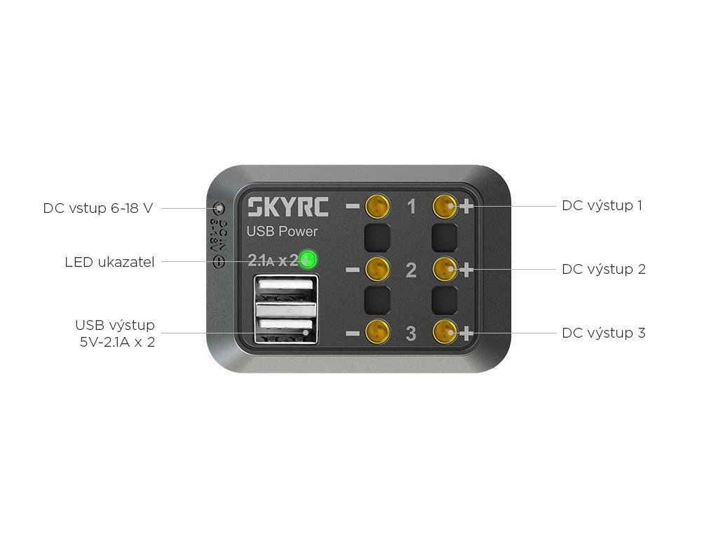 Kromě banánkových zdířek jsou na DC Power Distributoru dva USB výstupy – napájecí zásuvky 5 V/2,1 A pro napájení/nabíjení tabletů, smartphonů, digitálních kamer a fotoaparátů apod.