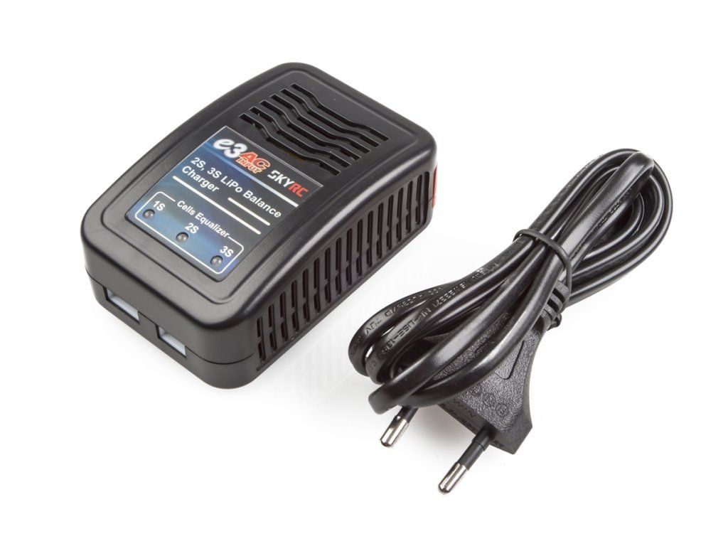 Nabíječ SKY RC e3 s vestavěným balancerem je velmi jednoduchý "krabičkový" nabíječ pro rekreační jezdce a letce se síťovým napájením pro nabíjení Li-poly akumulátorů. Je ideálním doplňkem "setových" stavebnic umožňující jednoduché nabíjení doma nebo výborným společníkem na cesty, kdy s sebou nechcete "tahat" velký, těžký a drahý nabíječ. Nabíjený akumulátor se připojuje k vestavěnému balanceru prostřednictvím servisního konektoru; nabíječ je opatřen dvěma zásuvkami (2s, 3s) pro konektory systému JST-XH. V jednu chvíli je možno nabíjet vždy jen jednu sadu - buď dvoučlánkovou, nebo tříčlánkovou.