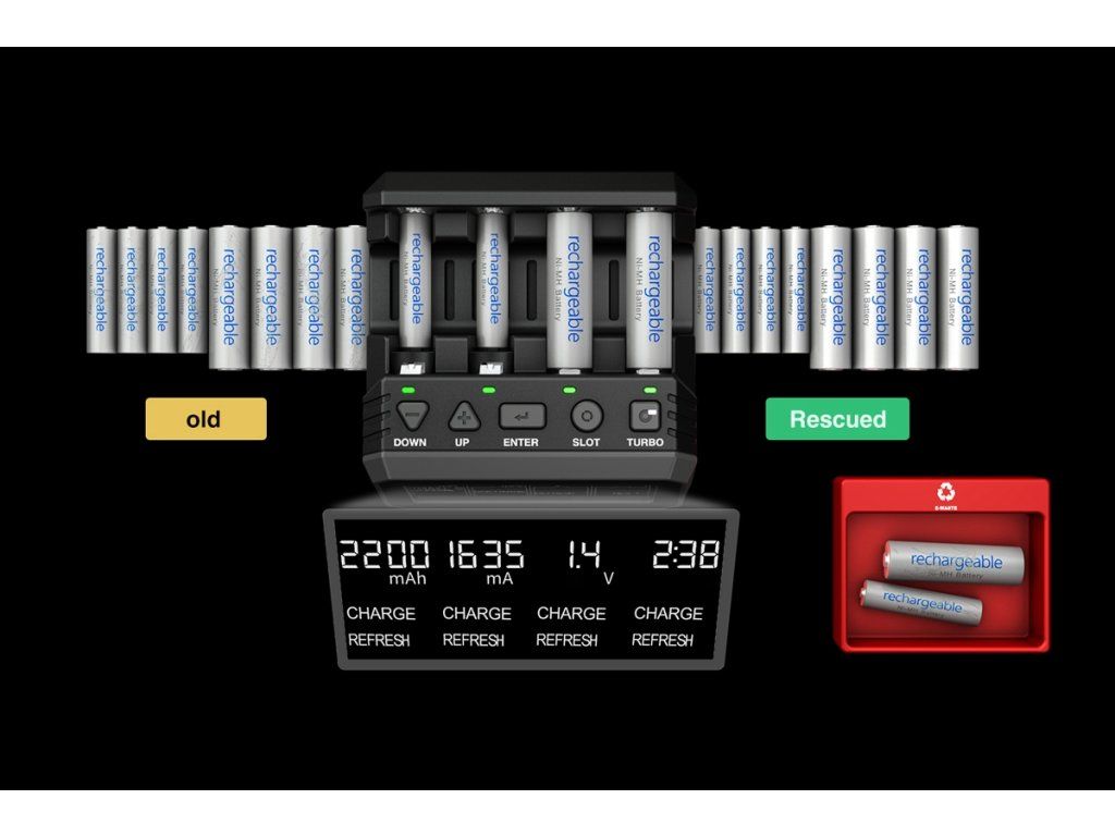 Multifunkční čtyřkanálový nabíječ/vybíječ zajišťující kompletní a opravdu komfortní péči o vaše AA (tužkové) a AAA (mikrotužkové) akumulátory NiCd a NiMH s kapacitou v rozsahu 500-3200 mAh. Inteligentní programy nabíječe se o vaše akumulátory postarají od úvodního formování malým proudem, přes pravidelné nabíjení a rychlonabíjení nebo vybíjení až po testování kapacity a oživování článků dlouhodobě provozovaných nebo naopak dlouhodobě uložených. Součástí sady nabíječe je i síťový zdroj.