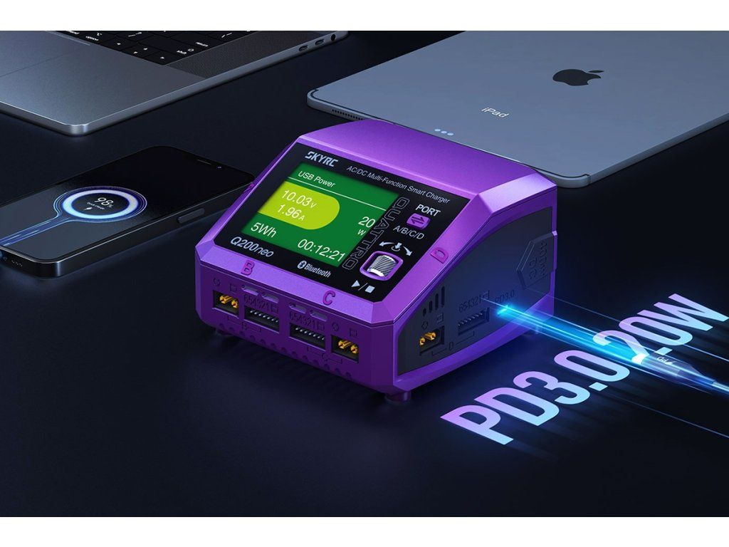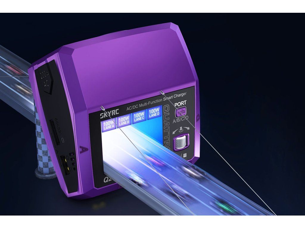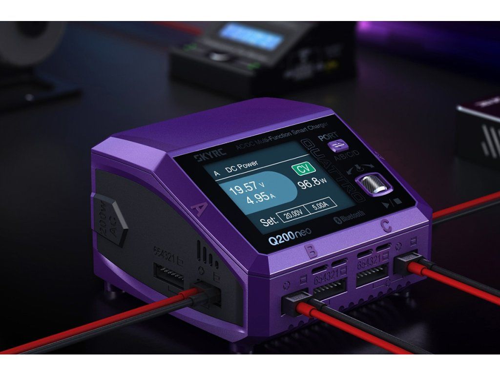 Čtyřkanálový nabíječ SKY RC Q200neo 400W byl konstruován se snahou poskytnout vše potřebné pro nabíjení čtyř akumulátorů proudy současně „pod jednou střechou" včetně síťového zdroje, s jednoduchou obsluhou a možností komunikace s aplikací SkyCharger. Q200neo umožňuje nabíjet a vybíjet běžné typy článků (NiCd, NiMH, Li-poly, Li-ion, Li-Fe, Li-HV, Pb), navíc jsou všechny kanály vybaveny vestavěnými šestikanálovými balancery, které zajišťují velmi bezpečné a komfortní nabíjení lithiových akumulátorů.