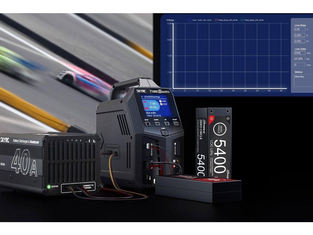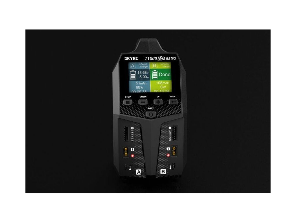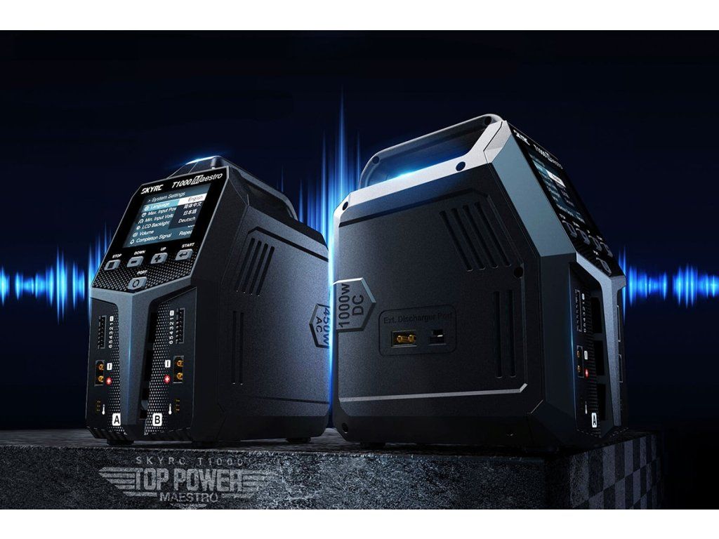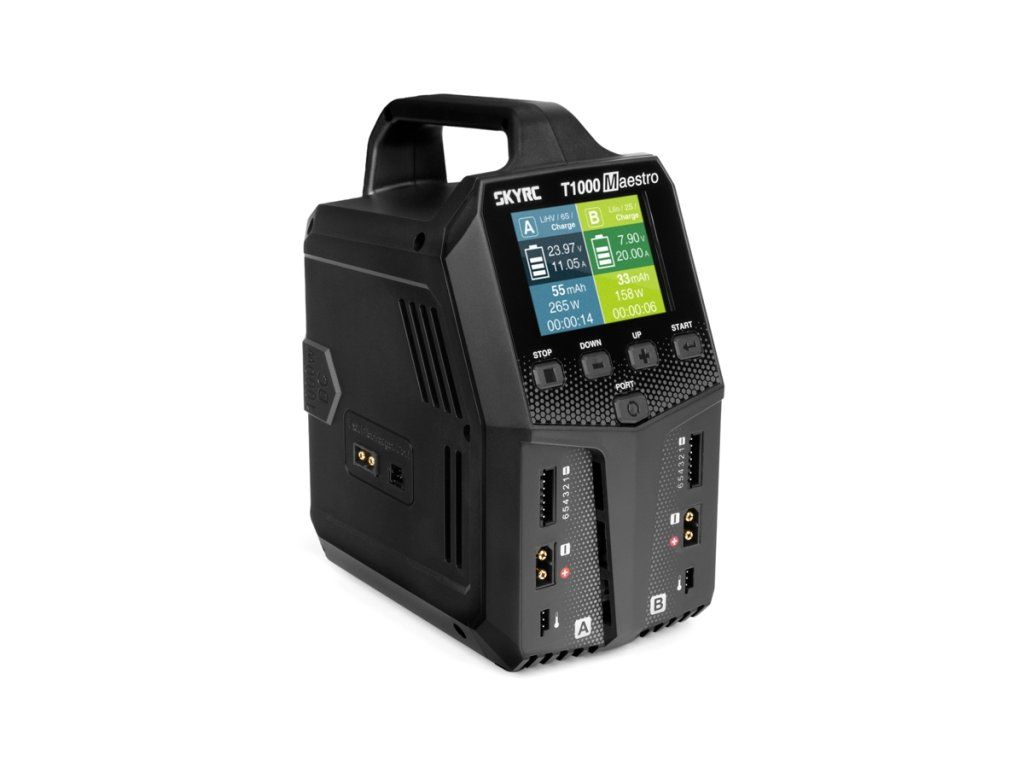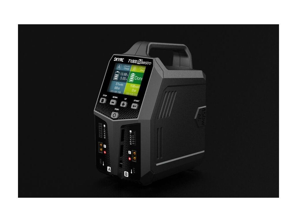 Dvoukanálový nabíječ SKY RC T1000 Maestro 1000W byl konstruován se snahou poskytnout vše potřebné pro nabíjení dvou akumulátorů velkými proudy současně „pod jednou střechou" včetně síťového zdroje a s jednoduchou obsluhou. T1000 umožňuje nabíjet a vybíjet běžné typy článků (NiCd, NiMH, Li-poly, Li-ion, Li-Fe, Li-HV, Pb), navíc jsou oba kanály vybaveny vestavěnými šestikanálovými balancery, které zajišťují velmi bezpečné a komfortní nabíjení lithiových akumulátorů. Může také pracovat v režimu paralelního nabíjení, kdy oba kanály nabíjejí jeden akumulátor proudem 20-35 A. Při připojení externího vybíječe BD350 potom umožňuje vybíjení proudem až 40 A při max výkonu 350 W.